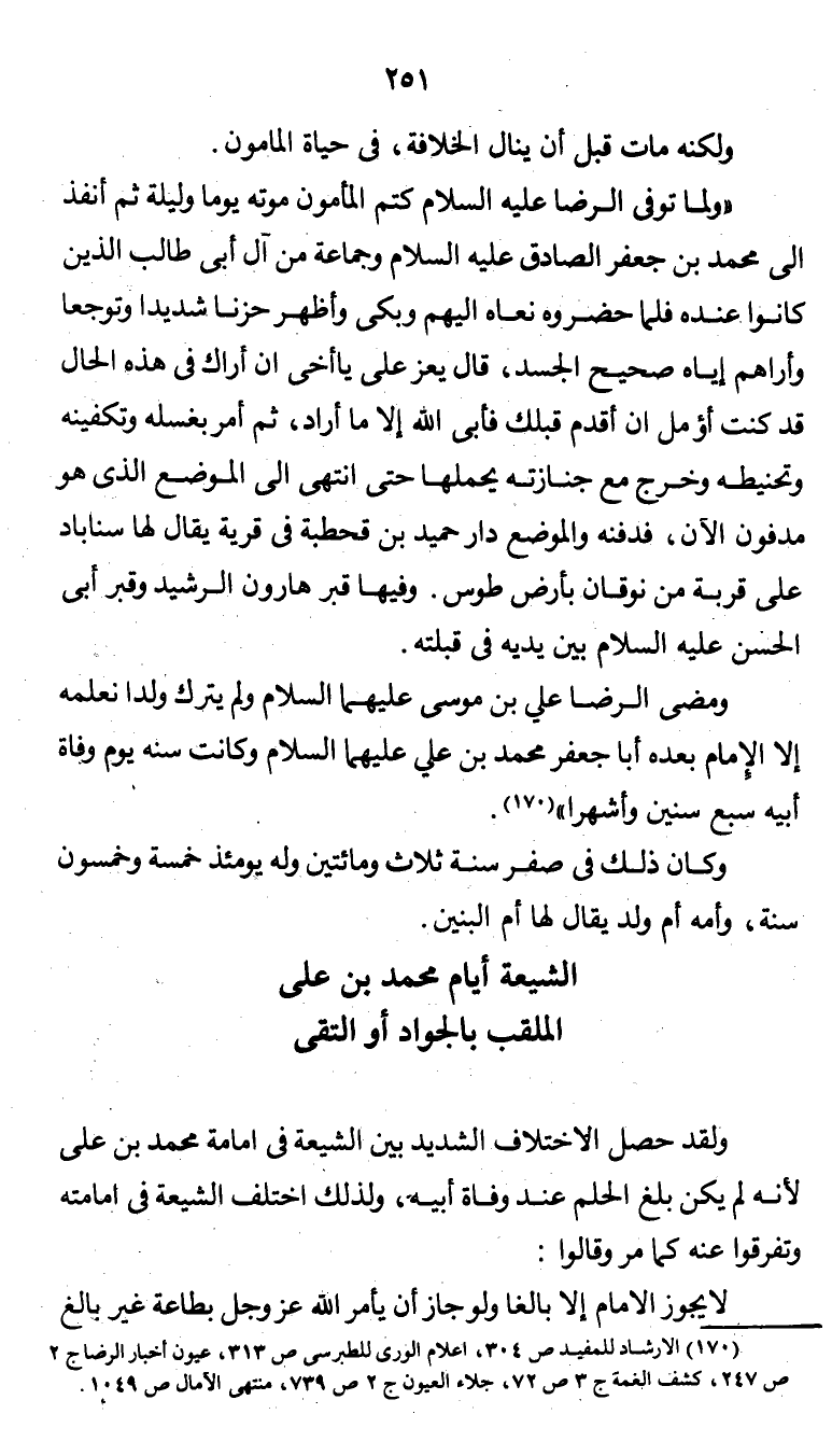 (¬1) الإرشاد للمفيد ص304، أعلام الورى للطبرسي ص313، عيون أخبار الرضا ج2 ص247، كشف الغمة ج3 ص72، جلاء العيون ج2ص739، منتهى الآمال ص1049.