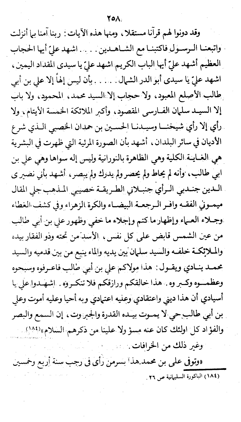 "ربنا آمنا بما أنزلت واتبعنا الرسول فاكتبنا مع الشاهدين .. أشهد عليّ أيها الحجاب العظيم، أشهد عليّ أيها الباب الكريم، أشهد عليّ يا سيدي المقداد اليمين، أشهد يا عليّ أبو الدر الشمال ... بأن ليس إلهاً إلا عليّ بن أبي طالب الأصلع المعبود، ولا حجاب إلا السيد محمد المحمود، ولا باب إلا السيد سلمان الفارسي المقصود، وأكبر الملائكة الخمسة الأيتام، ولا رأي إلا رأي شيخنا وسيدنا الحسين بن حمدان الخصبي الذي شرع الأديان في سائر البلدان. أشهد بأن الصورة المرئية التي ظهرت في البشرية هي الغاية الكلية، وهي الظاهرة بالنورانية، وليس إله سواها، وهي علي بن أبي طالب. وأنه لم يُحاط ولم يُحصر ولم يُدرك ولم يُبصر.