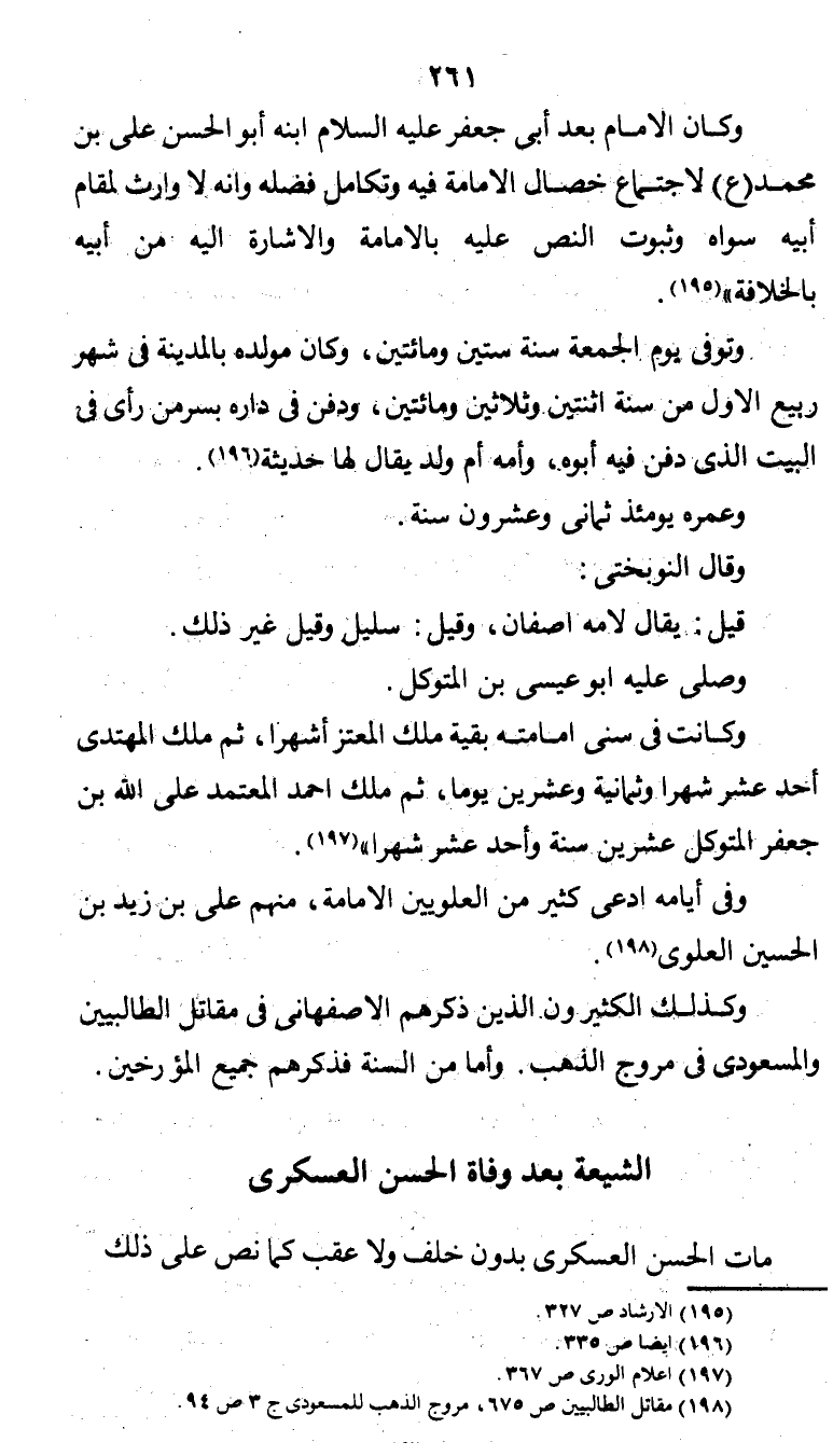" وكان الإمام بعد أبي جعفر عليه السلام إبنه أبو الحسن علي بن محمد (ع) لاجتماع خصال الإمامة فيه وتكامل فضله، وإنه لا وارث لمقام أبيه سواه، وثبوت النص عليه بالإمامة والإشارة إليه من أبيه بالخلافة " (¬1).