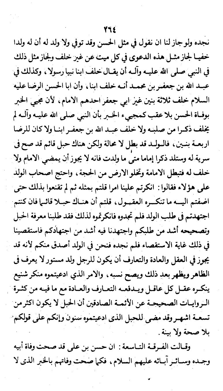 نجده، ولو جاز لنا أن نقول في مثل الحسن وقد توفي ولا ولد له أن له ولد، لجاز مثل هذه الدعوى في كل ميت من غير خلف، ولجاز مثل ذلك في النبي صلى الله عليه وآله أن يُقال خلف إبناً نبياً رسولا. وكذلك في عبد الله بن جعفر بن محمد أنه خلف إبنا، وأن أبا الحسن الرضا عليه السلام خلف ثلاثة بنين غير أبي جعفر أحدهم الإمام، لأن مجيئ الخبر بوفاة الحسن بلا عقب كمجيئ الخبر بأن النبي صلى الله عليه وآله لم يخلف ذكراً من صلبه، ولا خلف عبد الله بن جعفر إبناً، ولا كان للرضا أربعة بنين. فالولد قد بطل لا محالة، ولكن هناك حبل قائم قد صح في سرية له وستلد ذكراً إماماً متى ما ولدت، فإنه لا يجوز أن يمضي الإمام ولا خلف له، فتبطل الإمامة وتخلو الأرض من الحجة.