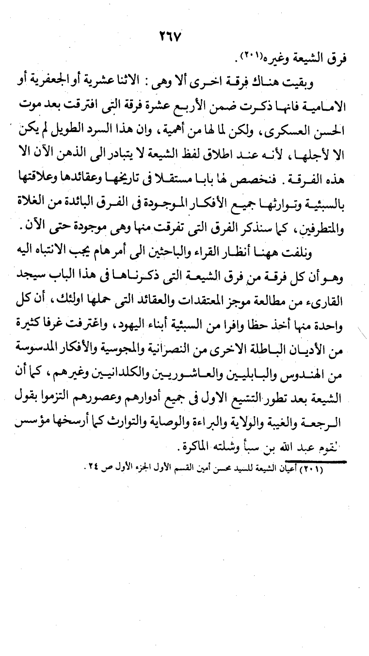ونلفت ههنا أنظار القرآء والباحثين إلى أمر هام يجب الإنتباه إليه، وهو ان كل فرقة من فرق الشيعة التي ذكرناها في هذا الباب سيجد القارئ من مطالعة موجز المعتقدات والعقائد التي حملها أؤلئك، أن كل واحدة منها أخذ حظاً وافراً من السبئية أبناء اليهود، واغترفت غرفاً كثيرة من الأديان الباطلة الأخرى من النصرانية والمجوسية والأفكار المدسوسة من الهندوس والبابليين والعاشوريين والكلدانيين وغيرهم، كما أن الشيعة بعد تطور التشيّع الأول في جميع أدوارهم وعصورهم، التزموا بقول الرجعة والغيبة والولاية والبراءة والوصاية والتوارث، كما أرسخها مؤسس القوم عبد الله بن سبأ وشلته الماكرة.