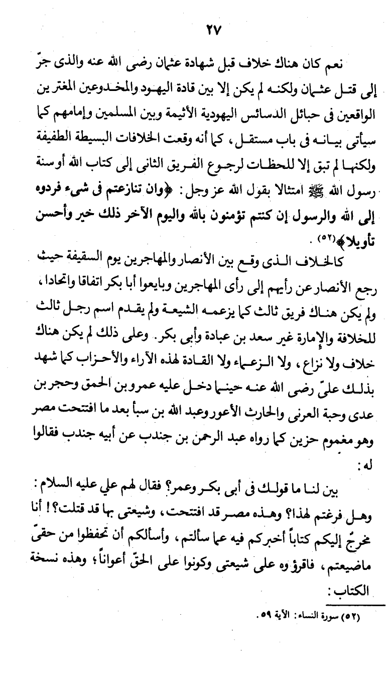 كالخلاف الذي وقع بين الأنصار والمهاجرين يوم السقيفة حيث رجع الأنصار عن رأيهم إلى رأي المهاجرين وبايعوا أبا بكر اتفاقا واتحادا ولم يكن هناك فريق ثالث كما يزعمه الشيعة ولم يقدم اسم رجل ثالث للخلافة والإمارة غير سعد بن عبادة وأبي بكر وعلى ذلك لم يكن هناك خلاف ولا نزاع ولا [زعماء ولا قادة] لهذه الآراء والأحزاب كما شهد بذلك علي رضي الله عنه حينما دخل عليه عمرو بن الحمق وحجر بن عدي وحبة العرني والحارث الأعور وعبد الله بن سبأ بعد ما افتتحت مصر وهو مغموم حزين كما رواه عبد الرحمن بن جندب عن أبيه جندب فقالوا له: