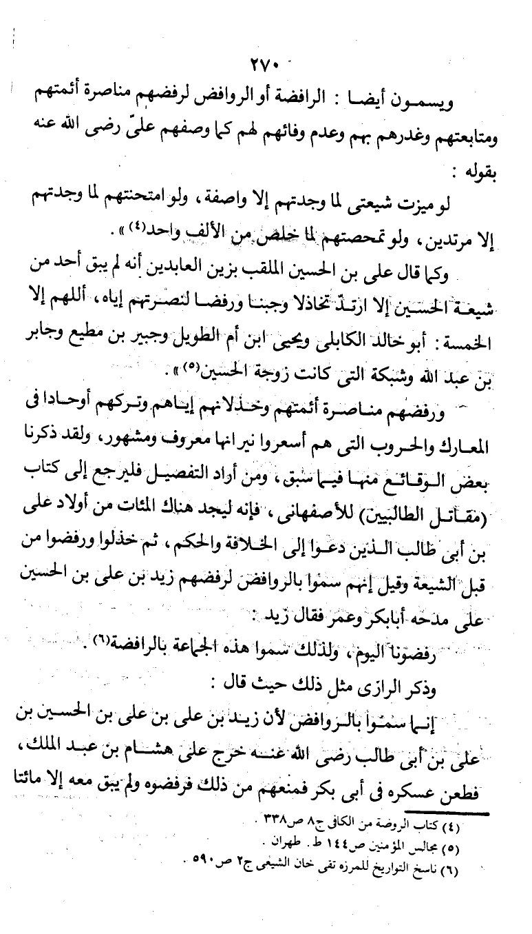 ورفضهم مناصرة أئمتهم وخذلانهم إياهم. وتركهم أوحاداً في المعارك والحروب التي هم أسعروا نيرانها معروف ومشهور، ولقد ذكرنا بعض الوقائع منها فيما سبق، ومن أراد التفصيل فليرجع إلى كتاب (مقاتل الطالبيين) للأصفهاني، فإنه ليجد هناك المئات من أولاد علي بن أبي طالب الذين دعوا إلى الخلافة والحكم، ثم خذلوا ورفضوا من قبل الشيعة وقيل إنهم سموا بالروافض لرفضهم زيد بن علي بن الحسين على مدحه أبا بكر وعمر فقال زيد: