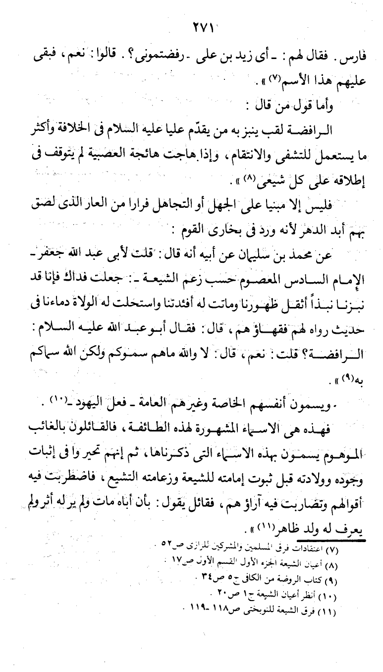 عن محمد بن سليمان عن أبيه أنه قال: "قلت لأبي عبد الله جعفر -الإِمام السادس المعصوم حسب زعم الشيعة-: جعلت فداك فإنا قد نبزنا نبذاً أثقل ظهورنا وماتت له أفئدتنا واستحلت له الولاة دماءنا في حديث رواه لهم فقهاؤهم، قال: فقال أبو عبد الله عليه السلام: الرافضة؟ قلت: نعم، قال: لا والله ما هم سموكم ولكن الله سماكم به (¬3) ".