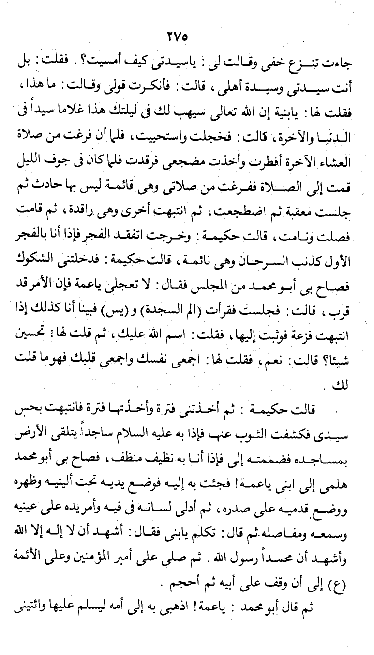 جاءت تنزع خفي وقالت لي: يا سيدتي كيف أمسيت؟. فقلت: بل أنت سيدتي وسيدة أهلي، قالت: فأنكرت قولي وقالت: ما هذا، فقلت لها: يا بنية إن الله تعالى سيهب لك في ليلتك هذا غلاماً سيداً في الدنيا والآخرة، قالت: فخجلت واستحييت، فلما أن فرغت من صلاة العشاء الآخيرة أفطرت وأخذت مضجعي فرقدت فلما كان في جوف الليل قمت إلى الصلاة ففرغت من صلاتي وهي قائمة ليس بها حادث ثم جلست معقبة ثم اضطجعت، ثم انتبهت أخرى وهي راقدة، ثم قامت فصلت ونامت، قالت حكيمة: وخرجت اتفقد الفجر فإذا أنا بالفجر الأول كذنب السرحان وهي نائمة، قالت حكيمة: فدخلتني الشكوك فصاح بي أبو محمد من المجلس فقال: لا تعجلي يا عمة فإن الأمر قد قرب، قال: فجلست فقرأت (الم السجدة) و (يس) فبينا أنا كذلك إذا انتبهت فزعة فوثبت إليها، فقلت: اسم الله عليك، ثم قلت لها: تحسين شيئاً؟ قالت: نعم، فقلت لها: اجمعي نفسك واجمعي قلبك فهو ما قلت لك.