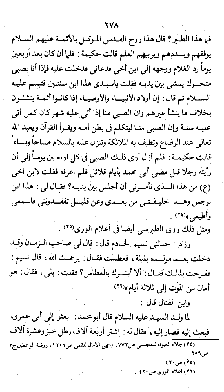 فما هذا الطير؟ قال هذا روح القدس الموكل بالأئمة عليهم السلام يوفقهم ويسددهم ويربيهم العلم قالت حكيمة: فلما أن كان بعد أربعين يوماً رد الغلام ووجهه إلى ابن أخي فدعاني فدخلت عليه فإذا أنا بصبي متحرك يمشي بين يديه فقلت يا سيدي هذا ابن سنتين فتبسم عليه السلام ثم قال: إن أولاد الأنبياء والأوصياء إذا كانوا أئمة ينشئون بخلاف ما ينشأ غيرهم وإن الصبي منا إذا أتى عليه شهر كان كمن أتى عليه سنة وإن الصبي منا ليتكلم في بطن أمه ويقرأ القرآن ويعبد الله تعالى عند الرضاع وتطيف به الملائكة وتنزل عليه بالسلام صباحاً ومساءاً قالت حكيمة: فلم أزل أرى ذلك الصبي في كل أربعين يوماً إلى أن رأيته رجلاً قبل مضي أبي محمد بأيام قلائل فلم أعرفه فقلت لابن أخي (ع) من هذا الذي تأمرني أن أجلس بين يديه؟ فقال لي: هذا ابن نرجس وهذا خليفتي من بعدي وعن قليل تفقدونني فاسمعي وأطيعي" (¬1).