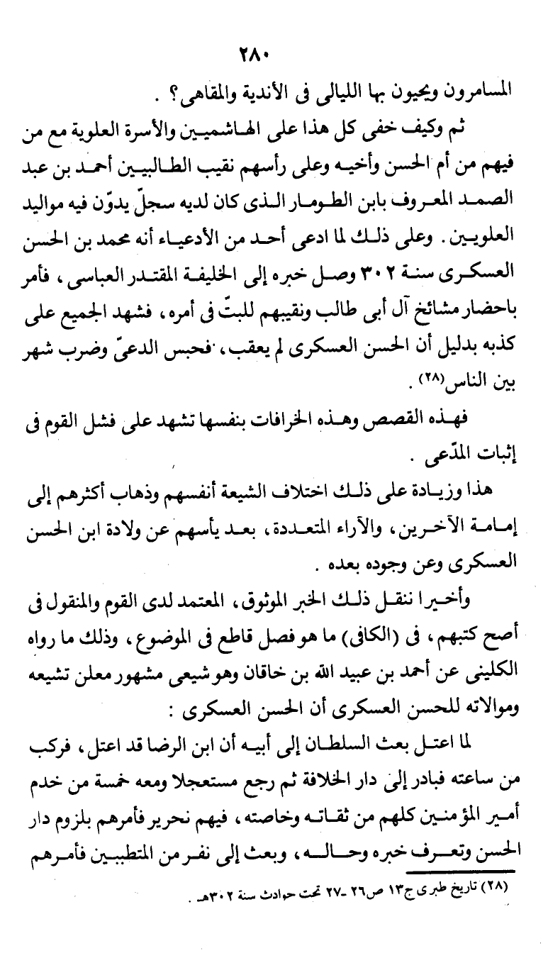 ثم وكيف خفى كل هذا على الهاشميين والأسرة العلوية مع من فيهم من أم الحسن وأخيه وعلى رأسهم نقيب الطالبيين أحمد بن عبد الصمد المعروف بابن الطومار الذي كان لديه سجل يدوّن فيه مواليد العلويين. وعلى ذلك لما ادعى أحد من الأدعياء أنه محمد بن الحسن العسكري سنة 302 وصل خبره إلى الخليفة المقتدر العباسي، فأمر باحضار مشائخ آل أبي طالب ونقيبهم للبتّ في أمره، فشهد الجميع على كذبه بدليل أن الحسن العسكري لم يعقب، فحبس الدعيّ وضرب شهر بين الناس (¬1).