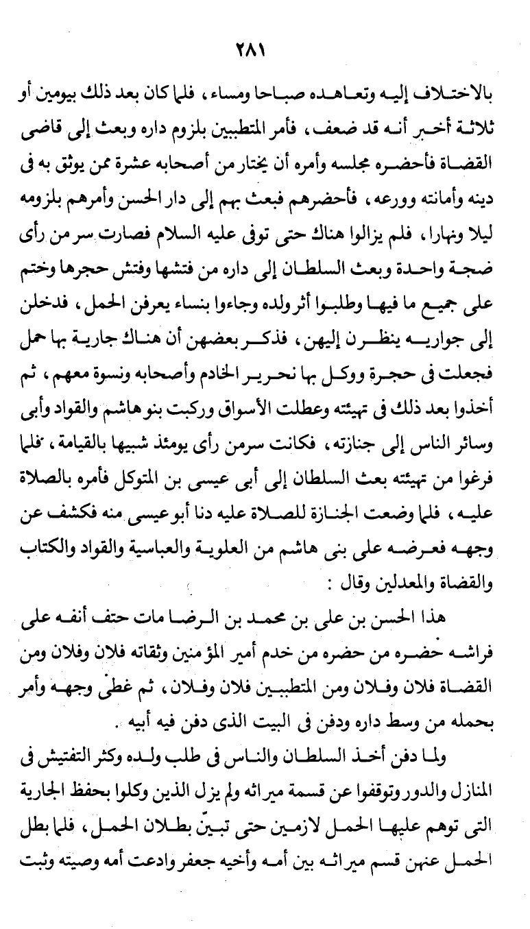 بالاختلاف إليه وتعاهده صباحاً ومساء، فلما كان بعد ذلك بيومين أو ثلاثة أخبر أنه قد ضعف، فأمر المتطببين بلزوم داره وبعث إلى قاضي القضاة فأحضره مجلسه وأمره أن يختار من أصحابه عشرة ممن يوثق به في دينه وأمانته وورعه، فأحضرهم فبعث بهم إلى دار الحسن وأمرهم بلزومه ليلاً ونهاراً، فلم يزالوا هناك حتى توفي عليه السلام فصارت سرمن رأى ضجة واحدة وبعث السلطان إلى داره من فتشها وفتش حجرها وختم على جميع ما فيها وطلبوا أثر ولده وجاءوا بنساء يعرفن الحمل، فدخلن إلى جواريه ينظرن إليهن، فذكر بعضهن أن هناك جارية بها حمل فجعلت في حجرة ووكل بها نحرير الخادم وأصحابه ونسوة معهم، ثم أخذوا بعد ذلك في تهيئته وعطلت الأسواق وركبت بنو هاشم والقواد وأبي وسائر الناس إلى جنازته، فكانت سرمن رأى يومئذ شبيهاً بالقيامة، فلما فرغوا من تهيئته بعث السلطان إلى أبي عيسى بن المتوكل فأمره بالصلاة عليه، فلما وضعت الجنازة للصلاة عليه دنا أبو عيسى منه فكشف عن وجهه فعرضه على بني هاشم من العلوية والعباسية والقواد والكتاب والقضاة والمعدلين وقال: