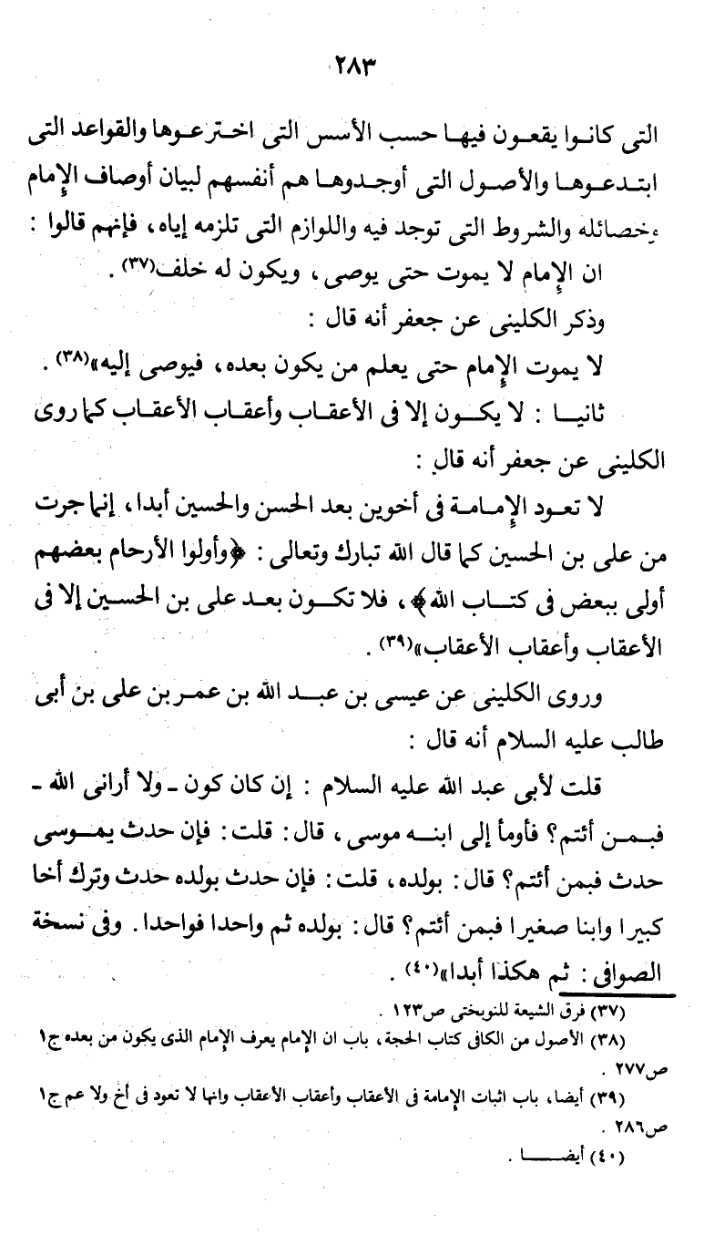(¬3) أيضاً، باب إثبات الإمامة في الأعقاب وأعقاب الأعقاب وأنها لا تعود في أخ ولا عم ج 1 ص 286.
