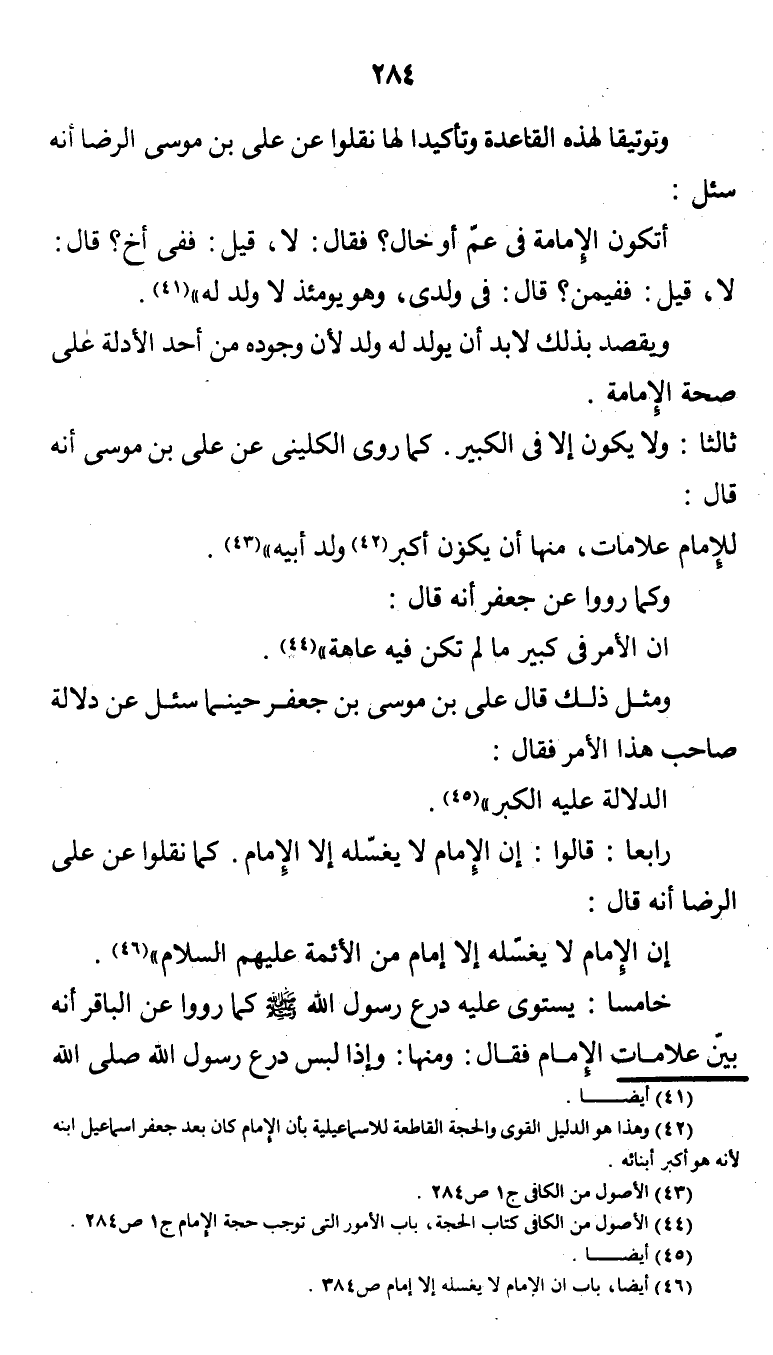 (¬4) الأصول من الكافي كتاب الحجة، باب الأمور التي توجب حجة الإمام ج 1 ص 284.