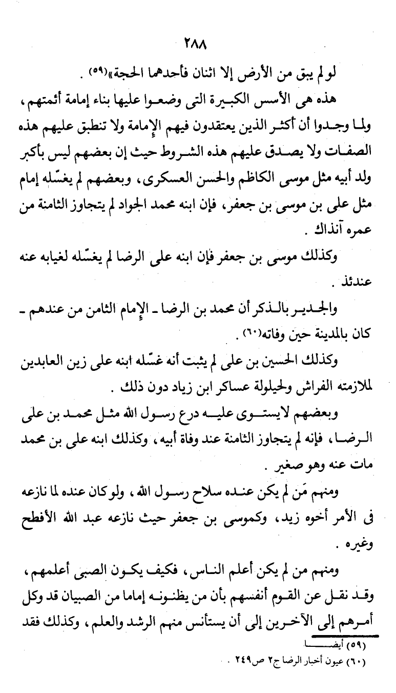 ومنهم مَن لم يكن عنده سلاح رسول الله، ولو كان عنده لما نازعه في الأمر أخوه زيد، وكموسى بن جعفر حيث نازعه عبد الله الأفطح وغيره.