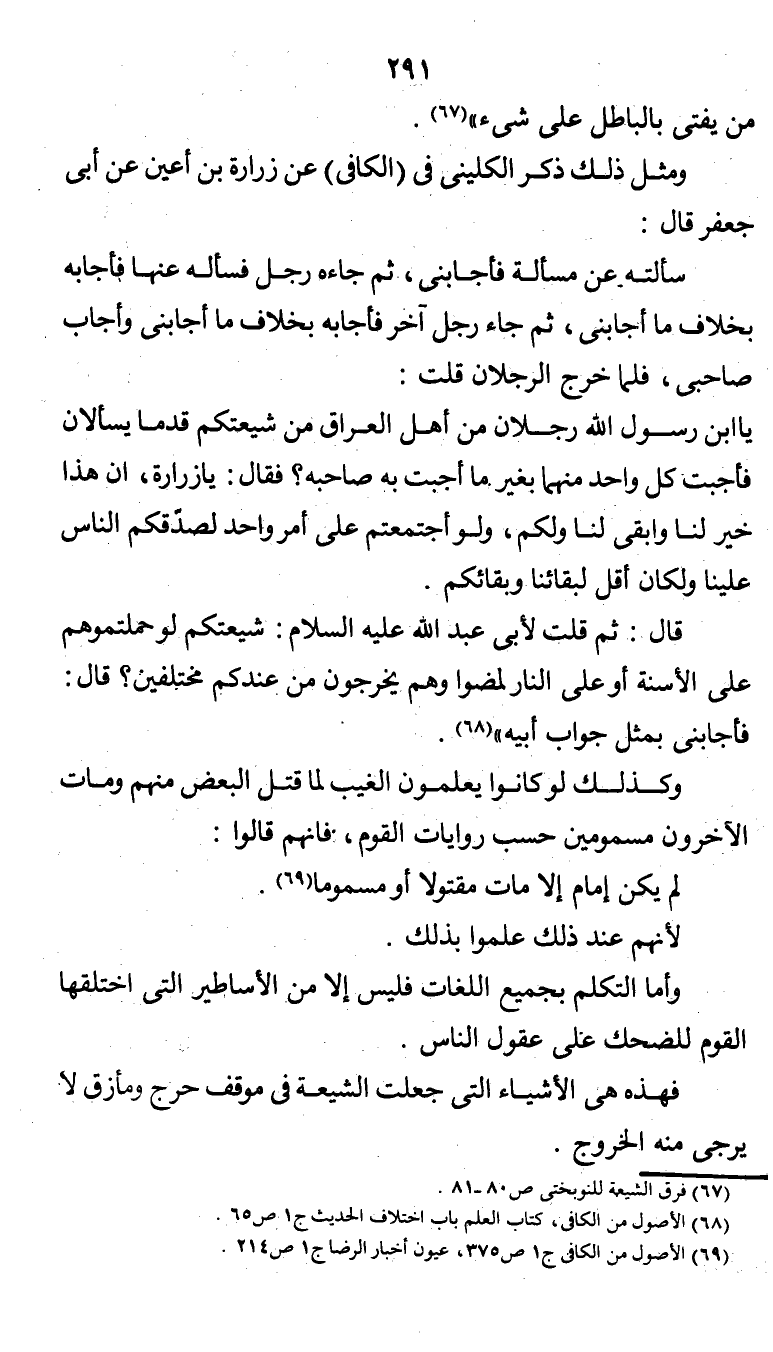 يا ابن رسول الله رجلان من أهل العراق من شيعتكم قدما يسألان فأجبت كل واحد منهما بغير ما أجبت به صاحبه؟ فقال: يا زرارة، إن هذا خير لنا وأبقى لنا ولكم، ولو اجتمعتم على أمر واحد لصدّقكم الناس علينا ولكان أقل لبقائنا وبقائكم.