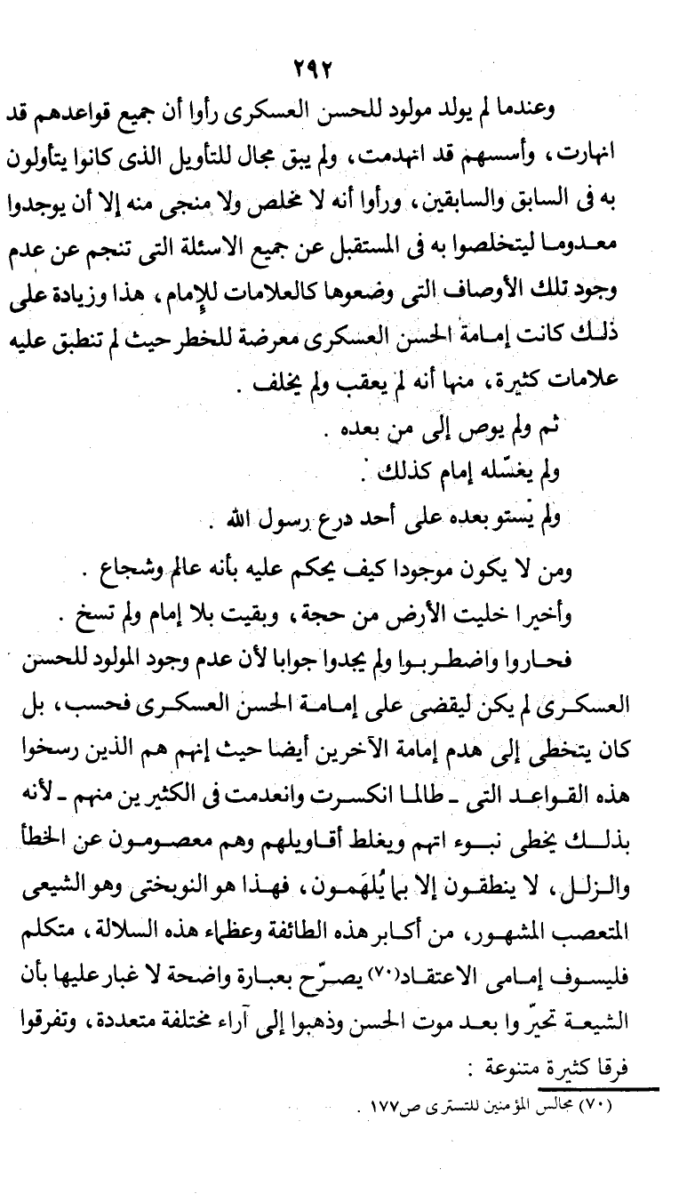 فحاروا واضطربوا ولم يجدوا جواباً لأن عدم وجود المولود للحسن العسكري لم يكن ليقضي على إمامة الحسن العسكري فحسب، بل كان يتخطى إلى هدم إمامة الآخرين أيضاً حيث إنهم هم الذين رسخوا هذه القواعد التي -طالما انكسرت وانعدمت في الكثيرين منهم- لأنه بذلك يخطي نبوءاتهم ويغلط أقاويلهم وهم معصومون عن الخطأ والزلل، لا ينطقون إلا بما يُلهَمون، فهذا هو النوبختي وهو الشيعي المتعصب المشهور، من أكابر هذه الطائفة وعظماء هذه السلالة، متكلم فليسوف إمامي الاعتقاد (¬1) يصرّح بعبارة واضحة لا غبار عليها بأن الشيعة تحيّروا بعد موت الحسن وذهبوا إلى آراء مختلفة متعددة، وتفرقوا فرقاً كثيرة متنوعة: