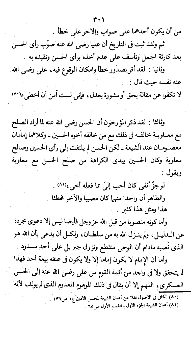 وثالثاً: لقد ذكر المؤرخون أن الحسن رضي الله عنه لما أراد الصلح مع معاوية خالفه في ذلك مع من خالفه أخوه الحسين -وكلاهما إمامان معصومان عند الشيعة- لكن الحسن لم يلتفت إلى رأي الحسين وصالح معاوية وكان الحسين يبدي الكراهة من صلح الحسن مع معاوية ويقول: