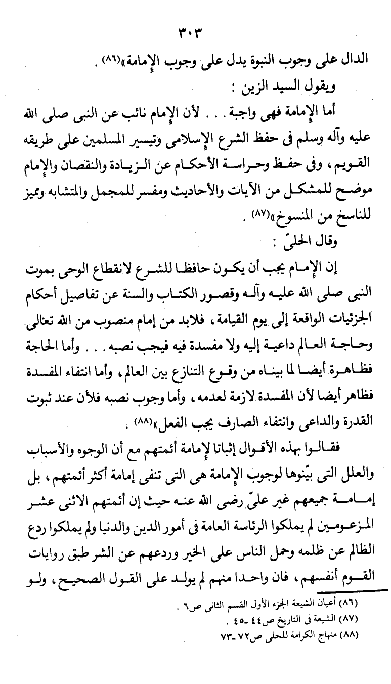 أما الأمامة فهى واجبة ... لأن الامام نائب عن النبي صلى الله عليه وآله وسلم في حفظ الشرع الإِسلامي وتيسير المسلمين على طريقه القويم، وفي حفظ وحراسة الأحكام عن الزيادة والنقضان والإِمام موضح للمشكل من الآيات والأحاديث ومفسر للمجمل والمتشابه ومميز للناسخ من المنسوخ" (¬2).