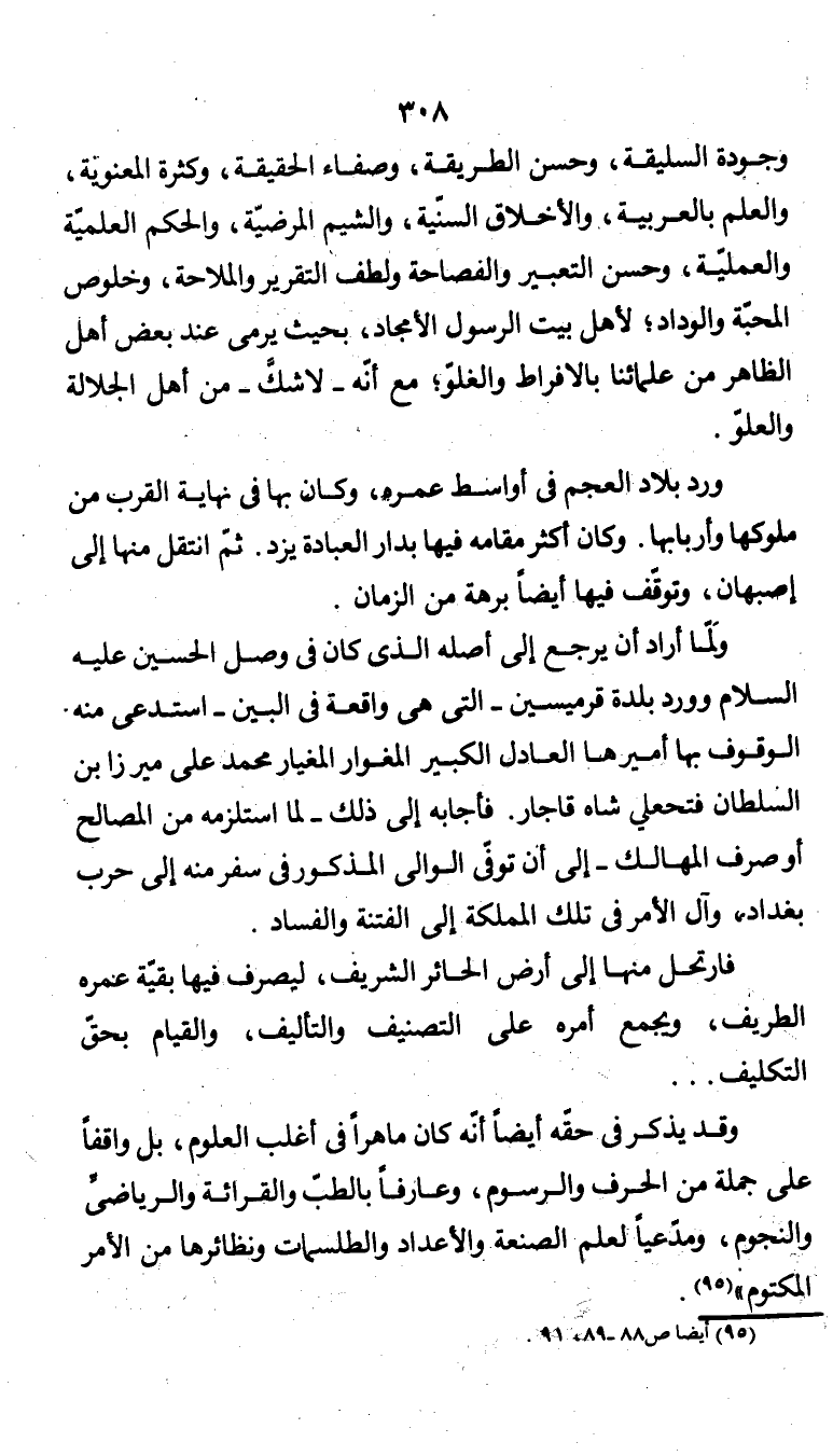 وجودة السليقة، وحسن الطريقة، وصفاء الحقيقة، وكثرة المعنوية، والعلم بالعربية، والأخلاق السنّية، والشيم المرضيّة، والحكم العلميّة والعمليّة، وحسن التعبير والفصاحة ولطف التقرير والملاحة، وخلوص المحبّة والوداد؛ لأهل بيت الرسول الأمجاد، بحيث يرمي عند بعض أهل الظاهر من علمائنا بالإفراط والغلوّ؛ مع أنَّه -لا شكَّ- من أهل الجلالة والعلوّ.