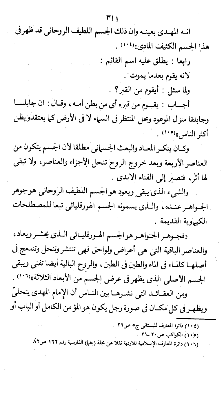 إنه المهدي بعينه وإن ذلك الجسم اللطيف الروحاني قد ظهر في هذا الجسم الكثيف المادي" (¬1).