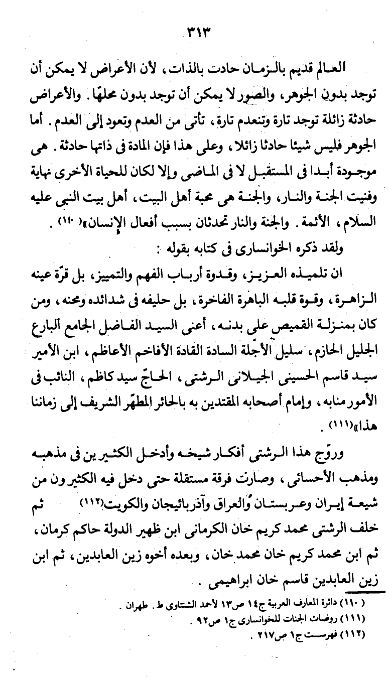 وروّج هذا الرشتي أفكار شيخه وأدخل الكثيرين في مذهبه ومذهب الأحسائي، وصارت فرقة مستقلة حتى دخل فيه الكثيرون من شيعة إيران وعربستان والعراق وآذربائيجان والكويت (¬3) ثم خلف الرشتي محمد كريم خان الكرماني ابن ظهير الدولة حاكم كرمان، ثم ابن محمد كريم خان محمد خان، وبعده أخوه زين العابدين، ثم ابن زين العابدين قاسم خان ابراهيمي.