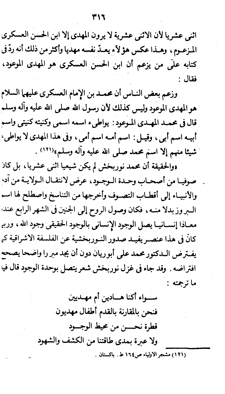 اثنى عشرياً لأن الاثنى عشرية لا يرون المهدي إلا ابن الحسن العسكري المزعوم، وهذا عكس هؤلاء يعدّ نفسه مهدياً وأكثر من ذلك أنه ردّ في كتابه على من يزعم أن ابن الحسن العسكري هو المهدي الموعود، فقال: