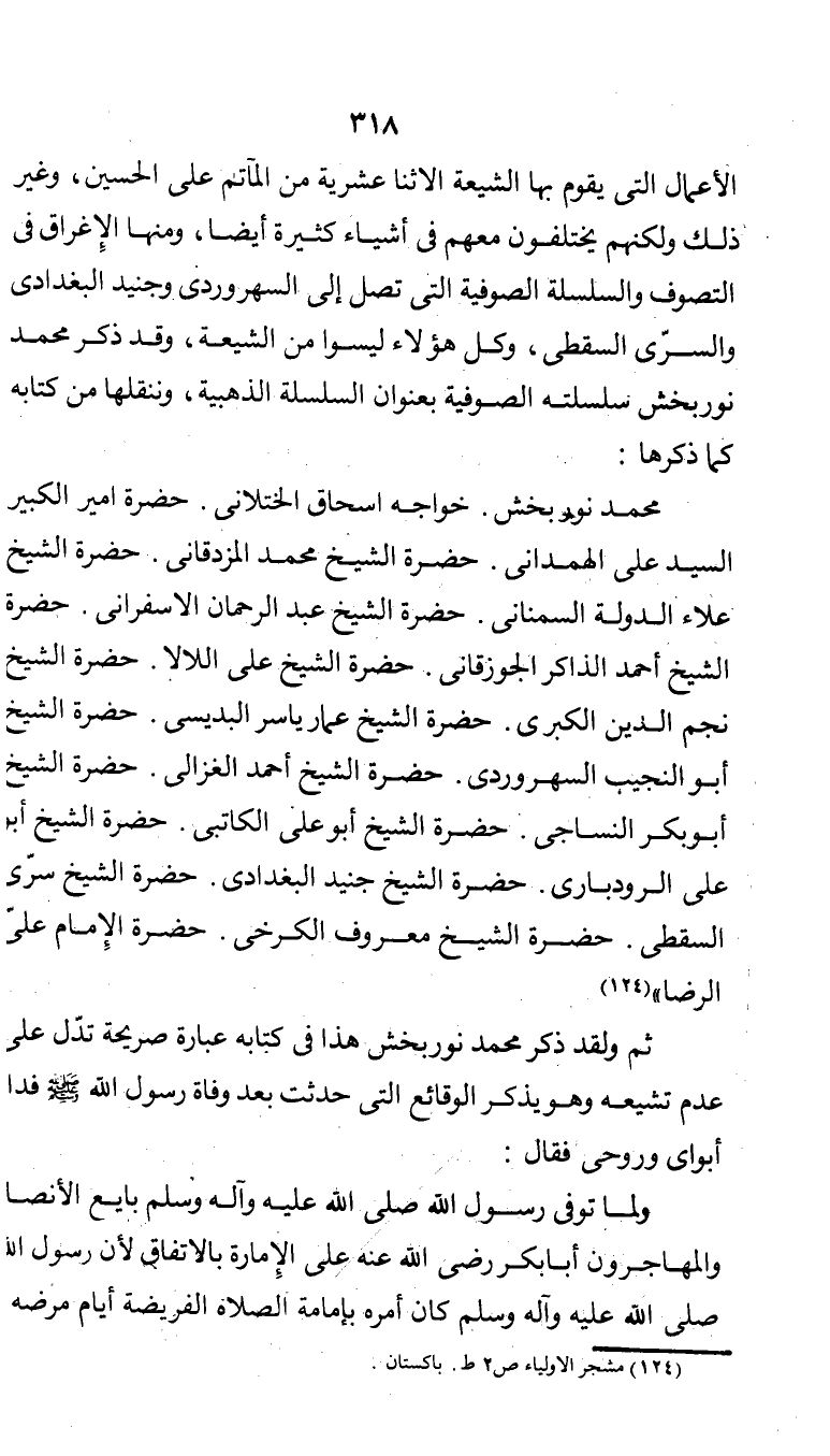 محمد نوربخش. خواجه إسحاق الختلاني. حضرة أمير الكبير السيد علي الهمداني. حضرة الشيخ محمد المزدقاني. حضرة الشيخ ْعلاء الدولة السمناني. حضرة الشيخ عبد الرحمان الإسفراني. حضرة الشيخ أحمد الذاكر الجوزقاني. حضرة الشيخ علي اللالا. حضرة الشيخ نجم الدين الكبرى. حضرة الشيخ عمار ياسر البديسي. حضرة الشيخ أبو النجيب السهروردي. حضرة الشيخ أحمد الغزالي. حضرة الشيخ أبو بكر النساجي. حضرة الشيخ أبو علي الكاتبي. حضرة الشيخ أبو علي الرودباري. حضرة الشيخ جنيد البغدادي. حضرة الشيخ سرّي السقطي. حضرة الشيخ معروف الكرخي. حضرة الإِمام عليّ الرضا" (¬1).