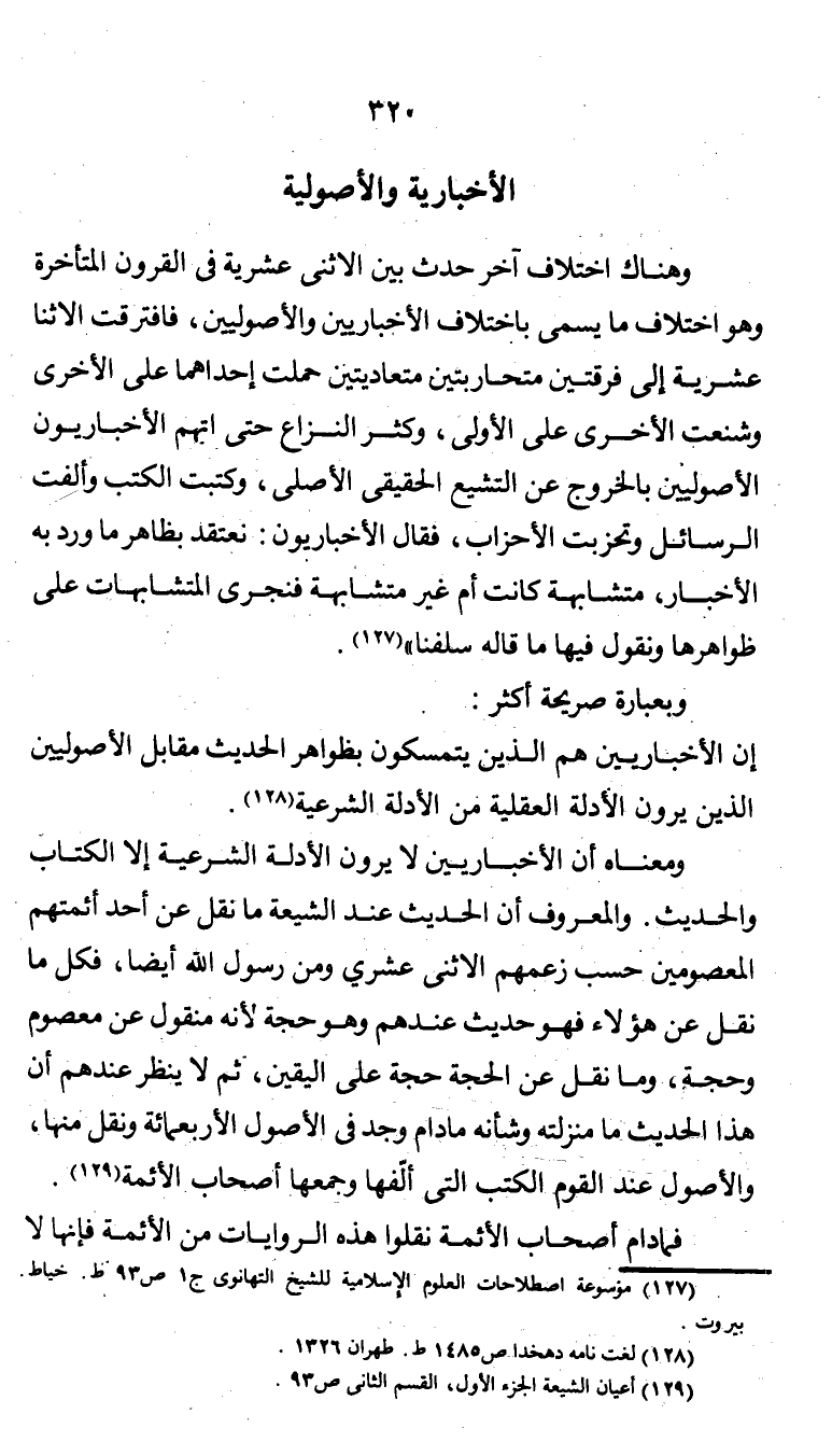 وهناك اختلاف آخر حدث بين الاثنى عشرية في القرون المتأخرة وهو اختلاف ما يسمى باختلاف الأخباريين والأصوليين، فافترقت الاثنا عشرية إلى فرقتين متحاربتين متعاديتين حملت إحداهما على الأخرى وشنعت الأخرى على الأولى، وكثر النزاع حتى اتهم الأخباريون الأصوليين بالخروج عن التشيع الحقيقي الأصلي، وكتبت الكتب وألفت الرسائل وتحزبت الأحزاب، فقال الأخباريون: نعتقد بظاهر ما ورد به الأخبار، متشابهة كانت أم غير متشابهة فنجري المتشابهات على ظواهرها ونقول فيها ما قاله سلفنا" (¬1).