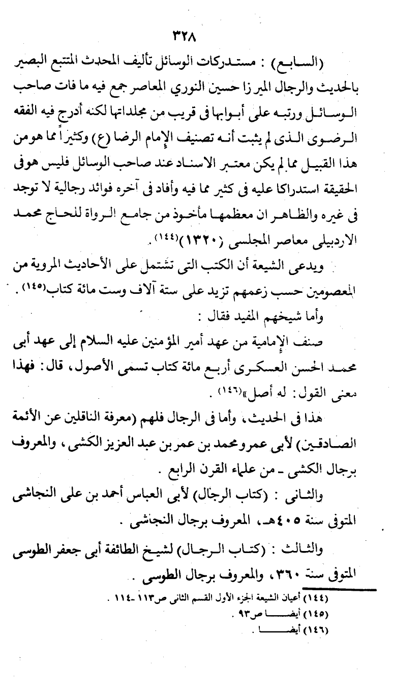 (السابع): مستدركات الوسائل تأليف المحدث المتتبع البصير بالحديث والرجال الميرزا حسين النوري المعاصر جمع فيه ما فات صاحب الوسائل ورتبه على أبوابها في قريب من مجلداتها لكنه أدرج فيه الفقه الرضوي الذي لم يثبت أنه تصنيف الإِمام الرضا (ع) وكثيراً مما هو من هذا القبيل مما لم يكن معتبر الإسناد عند صاحب الوسائل فليس هو في الحقيقة استدراكاً عليه في كثير مما فيه وأفاد في آخره فوائد رجالية لا توجد في غيره والظاهر أن معظمها مآخوذ من جامع الرواة للحاج محمد الأردبيلي معاصر المجلسي (1320) (¬1).