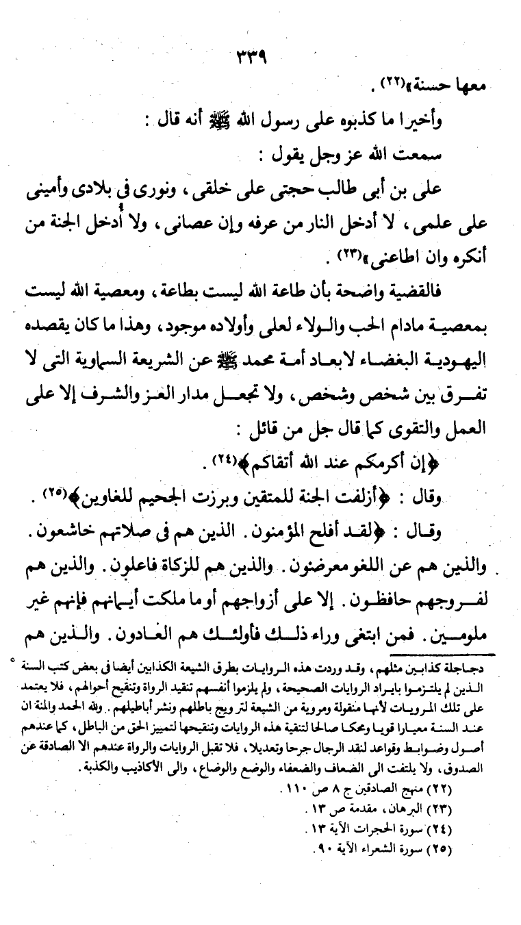 فالقضية واضحة بأن طاعة الله ليست بطاعة، ومعصية الله ليست بمعصية ما دام الحب والولاء لعلي وأولاده موجود. وهذا ما كان يقصده اليهودية البغضاء لإبعاد أمة محمد صلى الله عليه وسلم عن الشريعة السماوية التي لا تفرق بين شخص وشخص، ولا تجعل مدار العز والشرف إلا على العمل والتقوى، كما قال جل من قائل: