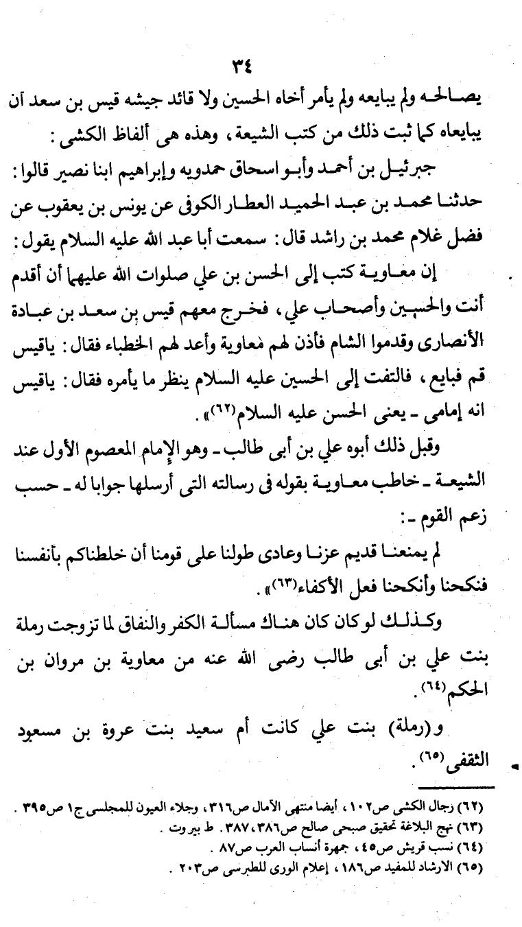 يصالحه ولم يبايعه ولم يأمر ولم يأمر أخاه الحسين ولا قائد جيشه قيس بن سعد أن يبايعاه كما ثبت ذلك في كتب الشيعة وهذه هي ألفاظ الكشي: