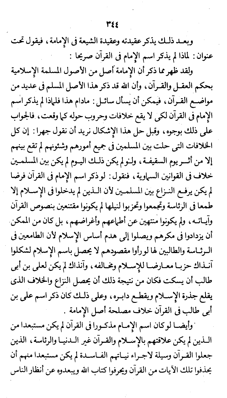 وبعد ذلك يذكر عقيدته، عقيدة الشيعة في الإمامة، فيقول تحت عنوان: لماذا لم يذكر إسم الإمام في القرآن صريحاً: