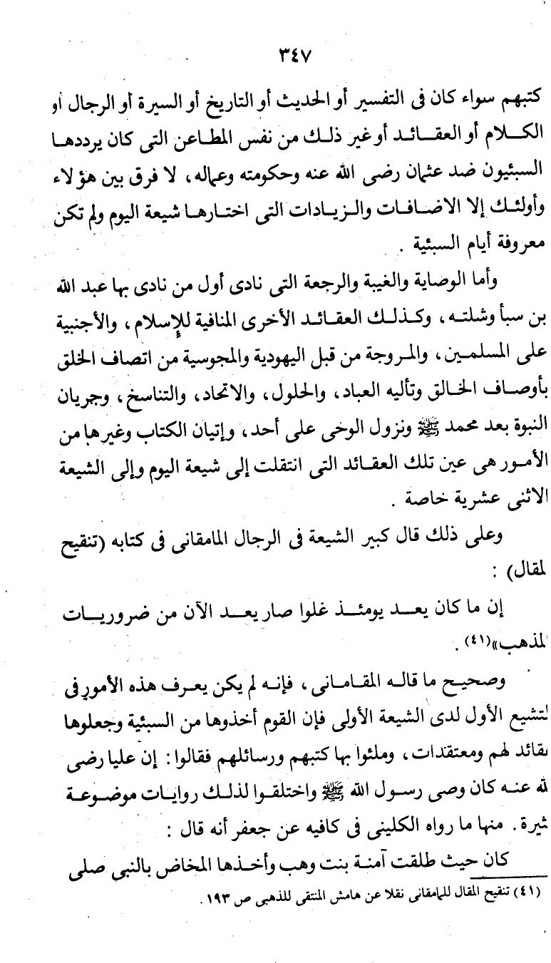 كتبهم سواء كان في التفسير أو الحديث أو التاريخ أو السيرة أو الرجال أو الكلام أو العقائد أو غير ذلك، من نفس المطاعن التي كان يرددها السبئيون ضد عثمان رضي الله عنه وحكومته وعماله، لا فرق بين هؤلاء وأولئك، إلا الإضافات والزيادات التي اختارها شيعة اليوم، ولم تكن معروفة أيام السبئية.