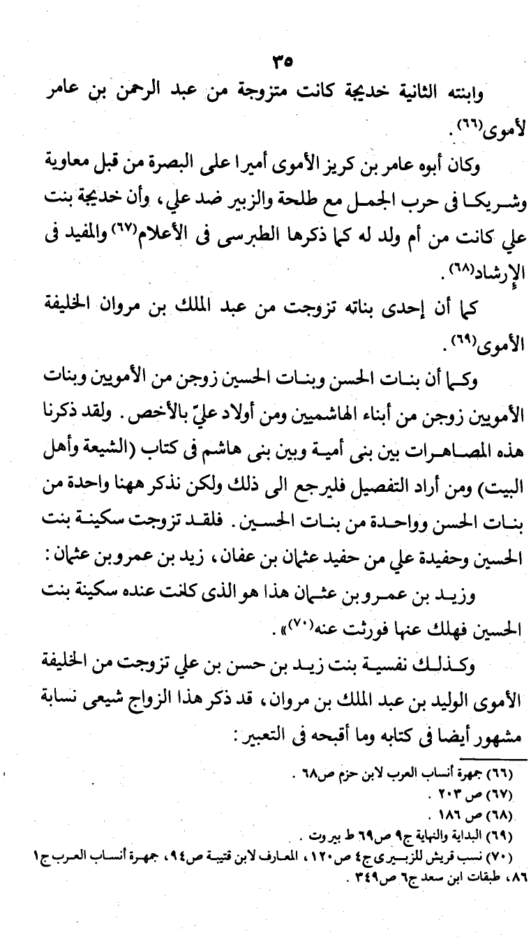 وكما أن بنات الحسن وبنات الحسين زوجن من الأمويين وبنات الأمويين زوجن من أبناء الهاشميين ومن أولاد علي بالأخص. ولقد ذكرنا هذه المصاهرات بين بني أمية وبين بني هاشم في كتاب (الشيعة وأهل البيت) ومن أراد التفصيل فليرجع إلى ذلك ولكن نذكر هاهنا واحدة من بنات الحسن وواحدة من بنات الحسين. فلقد تزوجت سكينة بنت الحسين وحفيدة علي من حفيد عثمان بن عفان: زيد بن عمرو بن عثمان