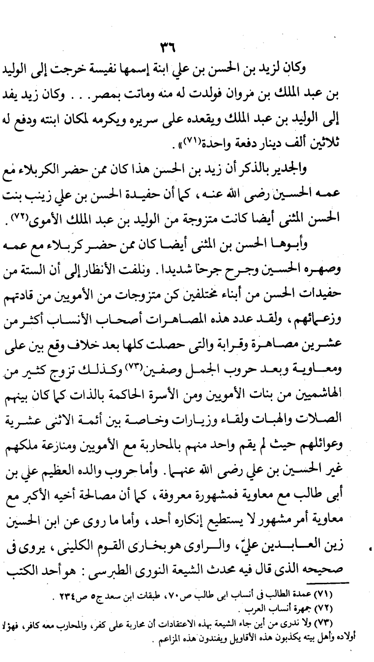 وقع بين علي ومعاوية وبعد حروب الجمل وصفين (¬3) وكذلك تزوج كثير من الهاشميين من بنات الأمويين ومن الأسرة الحاكمة بالذات كما كان بينهم الصلات والهبات ولقاء وزيارات وخاصة بين أئمة الإثني عشرية وعوائلهم حيث لم يقم واحد منهم [بمحاربة الأمويين] ومنازعة ملكهم غير الحسين بن علي رضي الله عنهما. وأما حروب والده العظيم علي بن أبي طالب مع معاوية فمشهورة معروفة، كما أن مصالحة أخيه الأكبر مع معاوية أمر مشهور لا يستطيع إنكاره أحد، وأما ما روي عن ابن الحسين زين العابدين علي، والراوي هو بخاري القوم الكليني، [حيث] يروي في صحيحه الذي قال فيه محدث الشيعة النوري الطبرسي " هو أحد الكتب