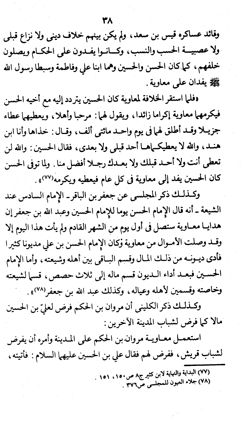 وكذلك ذكر المجلسي عن جعفر بن الباقر ـ الإمام السادس عند الشيعة ـ أنه قال الإمام الحسن يوماً للإمام الحسين وعبد الله بن جعفر إن هدايا معاوية ستصل في أول يوم من الشهر القادم ولم يأت هذا اليوم إلا وقد وصلت الأموال من معاوية وكان الإمام الحسن بن علي [مديناً بديون كثيرة فأداها] من ذلك المال وقسم الباقي بين أهله وشيعته، وأما الإمام الحسين فبعد أداء الديون قسم ماله إلى ثلاث حصص قسماً لشيعته وخاصته وقسمين لأهله وعياله، وكذلك عبد الله بن جعفر (¬2) ".