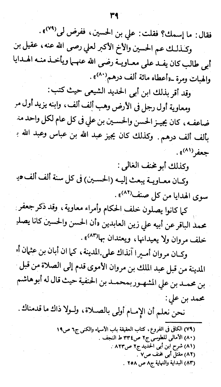 كما كانوا يصلون خلف الحكام وأمراء معاوية، وقد ذكر جعفر بن محمد الباقر عن أبيه علي زين العابدين " أن الحسن والحسين كانا يصليان خلف مروان ولا يعيدانها، ويعتدان بها (¬5) ".