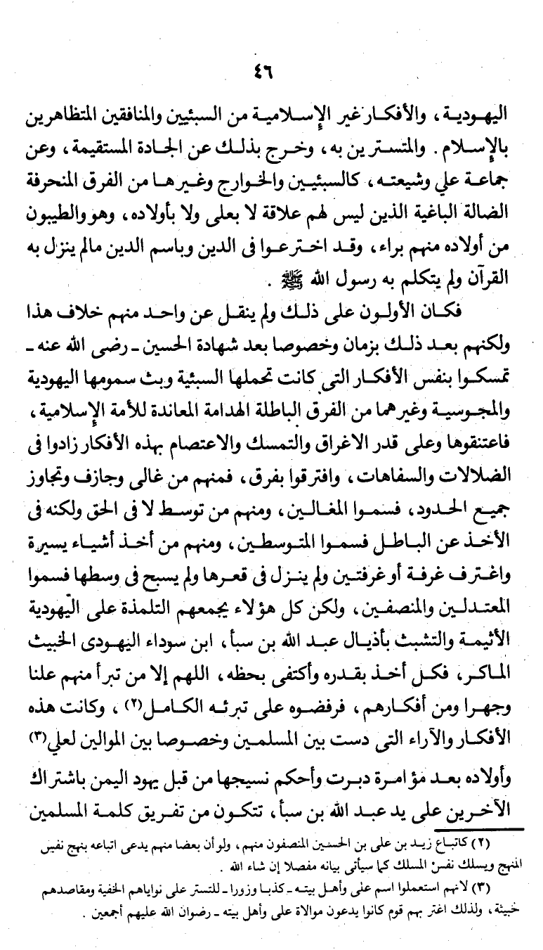 اليهودية والأفكار غير الإسلامية من السبئيين المتظاهرين بالإسلام، والمتسترين به، وخرج بذلك عن الجادة المستقيمة، وعن جماعة علي وشيعته، كالسبئيين والخوارج وغيرها من الفرق المنحرفة الضالة الباغية الذين ليس لهم علاقة لا بعلي ولا بأولاده، وهو والطيبون من أولاده منهم براء، وقد اخترعوا في الدين وباسم الدين ما لم ينزل به القرآن ولم يتكلم به رسول الله صلى الله عليه وسلم.