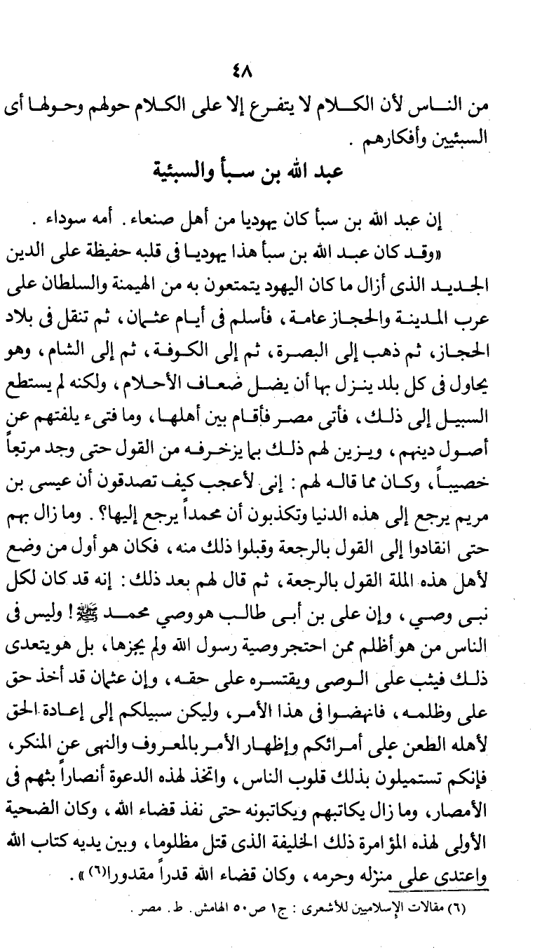 إن عبد الله بن سبأ كان يهودياً من أهل صنعاء. أمه سوداء " وقد كان عبد الله بن سبأ هذا يهودياً في قلبه حفيظة على الدين الجديد الذي أزال ما كان اليهود يتمتعون به من الهيمنة والسلطان على عرب المدينة والحجاز عامة، فأسلم في أيام عثمان، ثم تنقل في بلاد الحجاز، ثم ذهب إلى البصرة، ثم إلى الكوفة، ثم إلى الشام، وهو يحاول في كل بلد ينزل بها أن يضل ضعاف الأحلام، ولكنه لم يستطع السبيل إلى ذلك، فأتى مصر فأقام بين أهلها، وما فتئ يلفتهم/ عن أصول دينهم، ويزيد لهم بما يزخرفه من القول حتى وجد مرتعاً خصيباً، وكان مما قاله لهم: إني لأعجب كيف تصدقون أن عيسى بن مريم يرجع إلى هذه الدنيا وتكذبون أن محمداً يرجع إليها؟. وما زال بهم حتى انقادوا إلى القول بالرجعة وقبلوا ذلك منه، فكان هو أول من وضع لأهل هذه الملة القول بالرجعة وقبلوا ذلك منه، إنه قد كان لكل