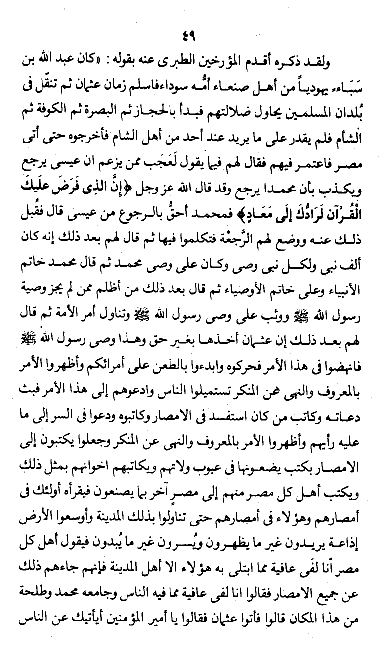 ولقد ذكره أقدم المؤرخين الطبري عنه بقوله:" كان عبد الله بن سبأ يهودياً من أهل صنعاء أمه سوداء فأسلم زمان عثمان ثم تنقل في بلدان المسلمين يحاول ضلالتهم فبدأ بالحجاز ثم البصرة ثم الكوفة ثم الشام فلم يقدر على ما يريد عند أحد من أهل الشام فأخرجوه حتى أتى مصر فاعتمر فيهم فقال لهم فيما يقول لعجب ممن يزعم أن عيسى يرجع ويكذب بأن محمد يرجع وقد قال الله عز وجل {إن الذي فرض عليك القرآن لرادك إلى معاد} فمحمد أحق بالرجوع من عيسى قال فقبل ذلك عنه ووضع لهم الرجعة فتكلموا فيها ثم قال لهم بعد ذلك أنه كان ألف نبي ولكل نبي وصي وكان علي وصي محمد ثم قال محمد خاتم الأنبياء وعلى خاتم الأوصياء ثم قال بعد ذلك من أظلم ممن لم يجز وصية رسول الله صلى الله عليه وسلم ووثب على وصي رسول الله صلى الله عليه وسلم وتناول أمر الأمة ثم قال لهم بعد ذلك إن عثمان أخذها بغير حق وهذا وصي رسول الله صلى الله عليه وسلم فانهضوا في هذا الأمر فحركوه وابدءوا بالطعن على أمرائكم وأظهروا الأمر بالمعروف والنهي عن المنكر تستميلوا الناس وادعوهم إلى هذا الأمر فبث دعاته وكاتب من كان استفسد في الأمصار وكاتبوه ودعوا في السر إلى ما عليه رأيهم وأظهروا الأمر بالمعروف والنهي عن المنكر وجعلوا يكتبون إلى الأمصار بكتب يضعونها في عيوب ولاتهم ويكاتبهم إخوانهم بمثل ذلك ويكتب أهل كل مصر منهم إلى مصر آخر بما يصنعون فيقرأه أولئك في أمصارهم وهؤلاء في أمصارهم حتى تناولوا بذلك المدينة وأوسعوا الأرض إذاعة يريدون غير ما يظهرون ويسرون غير ما يبدون فيقول أهل كل مصر إنا لفي عافية مما فيه الناس وجامعه محمد وطلحة من هذا المكان قالوا فأتوا عثمان فقالوا يا أمير المؤمنين أيأتيك عن الناس