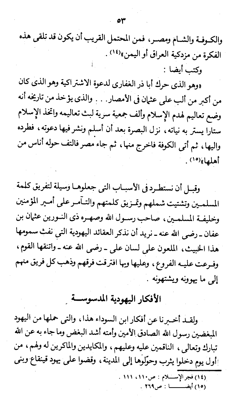 " وهو الذي حرك أبا ذر الغفاري لدعوة الاشتراكية وهو الذي كان من أكبر من ألب على عثمان في الأمصار .... والذي يؤخذ من تاريخه أنه وضع تعاليم لهدم