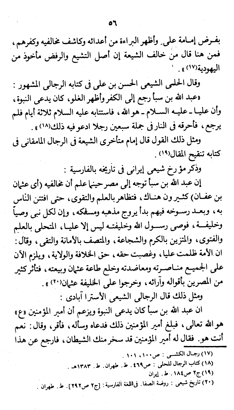 إن عبد الله بن سبأ كان يدعي النبوة ويزعم أن أمير المؤمنين "ع" هو الله تعالى، فبلغ أمير المؤمنين ذلك فدعاه وسأله، فأقر، وقال: نعم أنت هو. فقال له أمير المؤمنين قد سخر منك الشيطان، فارجع عن هذا