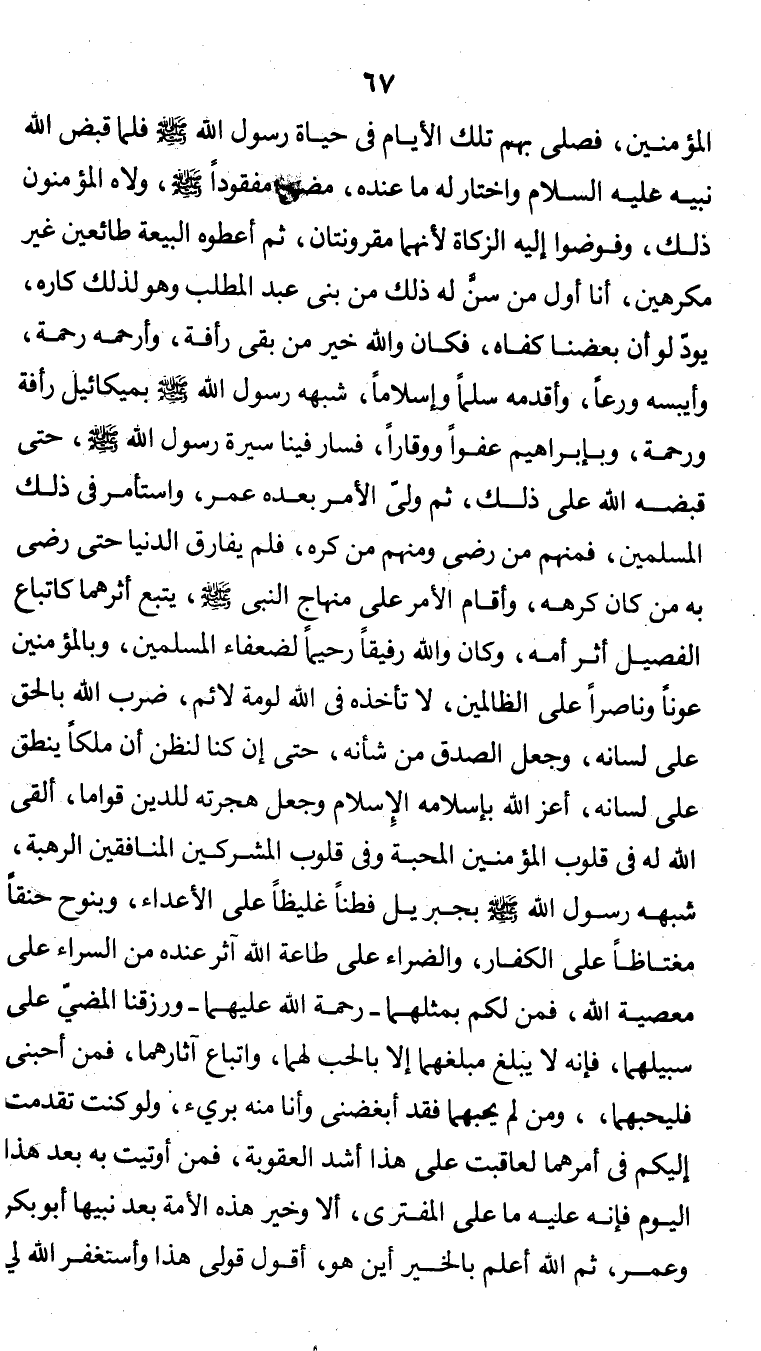 المؤمنين فصلى بهم تلك الأيام في حياة رسول الله صلى الله عليه وسلم فلما قبض الله نبيه عليه السلام واختار له ما عنده، مضى مفقودا صلى الله عليه وسلم، ولاه المؤمنين ذلك، وفوضوا إليه الزكاة لأنهما مقرونتان، ثم أعطوه البيعة طائعين غير مكرهين، أنا أول من سن له ذلك من بني عبد المطلب وهو لذلك كاره، يود لو أن بعضنا كفاه، فكان والله خير من بقي رأفة، وأرحمه رحمة، وأيبسه ورعاً، وأقدمه سلماً وإسلاما، شبهه رسول الله صلى الله عليه وسلم بميكائيل رأفة ورحمة، وبإبراهيم عفواً ووقارا، فسار فينا سيرة رسول الله صلى الله عليه وسلم، حتى قبضه الله على ذلك، ثم ولى الأمر بعده عمر، واستأمر في ذلك المسلمين، فمنهم من رضي منهم ومنهم من كره، فلم يفارق الدنيا حتى رضي به من كان كرهه، وأقام الأمر على منهاج النبي صلى الله عليه وسلم، يتبع أثرهما كاتباع الفصيل أثر أمه، وكان والله رفيقاً رحيماً لضعفاء المسلمين، وبالمؤمنين عوناً وناصراً على الظالمين، لا تأخذه في الله لومة لائم، ضرب الله بالحق على لسانه، وجعل الصدق من شانه، حتى إن كنا لنظن أن ملكاً ينطق على لسانه، أعز الله بإسلامه الإسلام وجعل هجرته للدين قواماً، ألقى الله له في قلوب المؤمنين المحبة وفي قلوب المشركين المنافقين الرهبة، شبهه رسول الله صلى الله عليه وسلم بجبريل فظاً غليظاً على الأعداء، وبنوح حنقاً مغتاضاً على الكفار، والضراء على طاعة الله آثر عنده من السراء على معصية الله فمن لكم بمثلهما ـ رحمة الله عليهما ـ ورزقنا المضي على سبيلهما، فإنه لا يبلغ مبلغهما إلا بالحب لهما ن واتباع آثارهما، فمن أحبني فليحبهما ن ومن لم يحبهما فقد أبغضني وأنا منه بريء، ولو كنت تقدمت إليكم في أمرهما لعاقبت على هذا اشد العقوبة، فمن أوتيت به بعد هذا اليوم فإن عليه ما على المفتري، ألا وخير هذه الأمة بعد نبيها أبو بكر وعمر، ثم الله أعلم بالخير أين هو، أقول قولي هذا وأستغفر الله لي