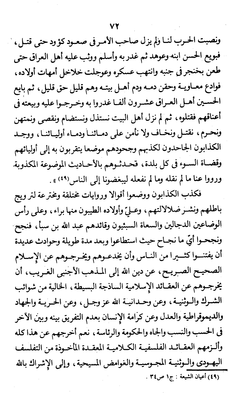 فكذب الكذابون ووضعوا أقوالاً وروايات مختلقة ومخترعة لترويج باطلهم ونشر ضلالاتهم، وعليّ وأولاده الطيبون منها براء، وعلى رأس الوضاعين الدجالين والسعاة السبئيون وقائدهم عبد الله بن سبأ، فنجح ونجحوا أيما نجاح حيث استطاعوا وبعد مدة طويلة وحوادث عديدة أن يفتنوا كثيراً من الناس وأن يخدعوهم ويخرجوهم عن الإسلام الصحيح الصريح، عن دين الله إلى المذهب الأجنبي الغريب، أن يخرجوهم عن العقائد الإسلامية الساذجة البسيطة، الخالية من شوائب الشرك والوثنية، وعن وحدانية الله عز وجل، وعن الحرية والجهاد والديمقراطية! والعدل وعن كرامة الإنسان بعدم التفريق بينه وبين الآخر في الحسب والنسب والجاه والحكومة والرئاسة، نعم أخرجهم عن هذا كله وألزمهم العقائد الفلسفية الكلامية المعقدة المأخوذة عن التفلسف اليهودي والوثنية المجوسية والغوامض المسيحية، وإلى الإشراك بالله