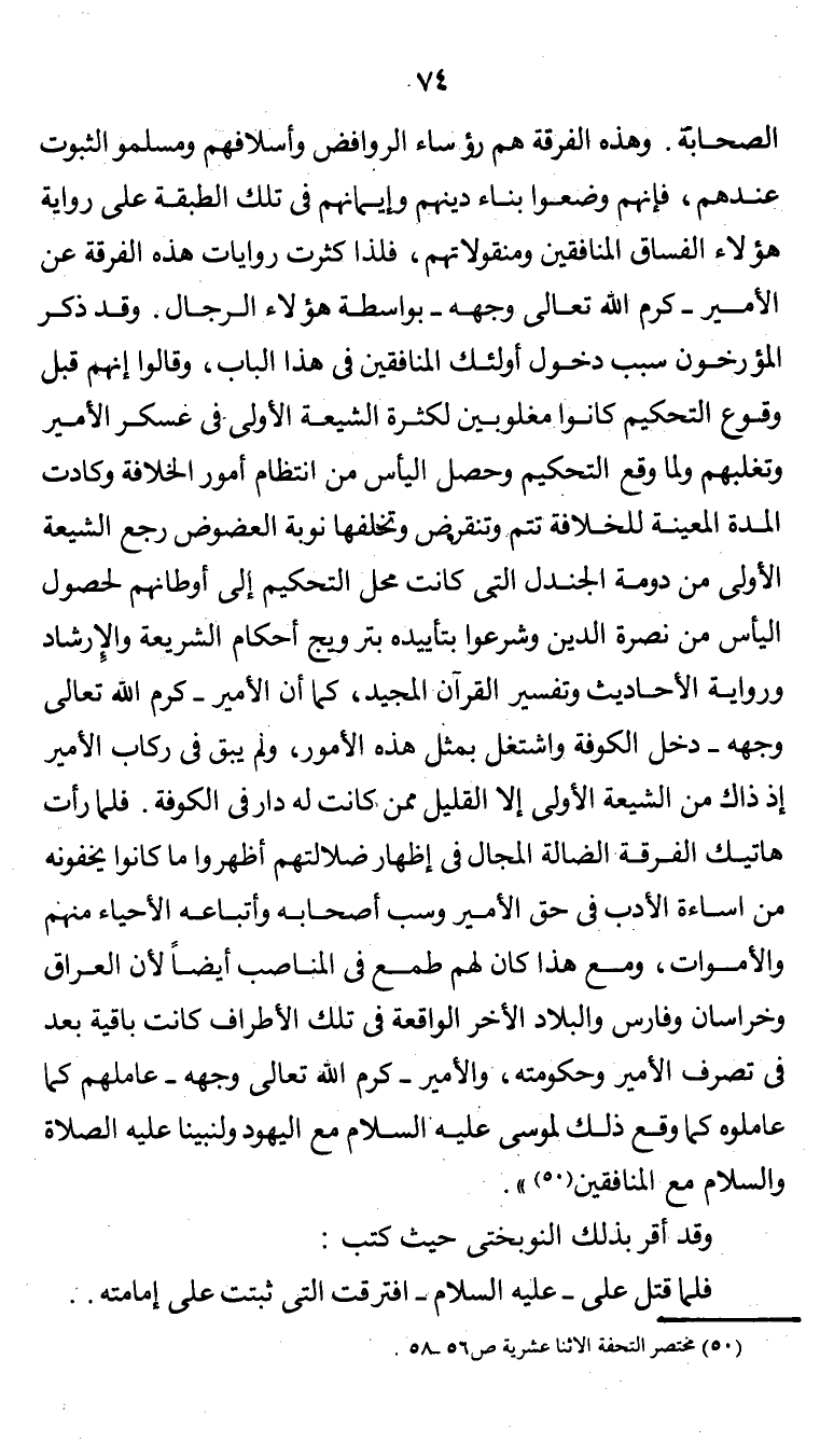 وهذه الفرقة هم رؤساء الروافض وأسلافهم ومسلمو الثبوت عندهم فإنهم وضعوا بناء دينهم وأيمانهم في تلك الطبقة على رواية هؤلاء الفساق المنافقين ومنقولاتهم، فلذا كثرت روايات هذه الفرقة عن الأمير ـ كرم الله تعالى وجهه ـ بواسطة هؤلاء الرجال. وقد ذكر المؤرخون سبب دخول أولئك المنافقين في هذا الباب، وقالوا إنهم قبل وقوع التحكيم كانوا مغلوبين لكثرة الشيعة الأولى في عسكر الأمير وتغلبهم ولما وقع التحكيم وحصل اليأس من انتظام أمور الخلافة وكادت المدة المعينة للخلافة تتم وتنقرض وتخلفها نوبة العضوض رجع الشيعة الأولى من دومة الجندل التي كانت محل التحكيم إلى أوطانهم لحصول اليأس من نصرة الدين وشرعوا بتأييده بترويج أحكام الشريعة والإرشاد ورواية الأحاديث وتفسير القرآن المجيد كما أن الأمير ـ كرم الله تعالى وجهه ـ دخل الكوفة واشتغل بمثل هذه الأمور، ولم يبق في ركاب الأمير إذ ذاك من الشيعة الأولى إلا القليل ممن كانت له دار في الكوفة فلما رأت هاتيك الفرقة الضالة المجال في إظهار ضلالتهم أظهروا ما كانوا يخفونه من إساءة الأدب في حق الأمير وسب أصحابه وأتباعه الأحياء منهم والأموات، ومع هذا كان لهم طمع في المناصب أيضاً لأن العراق وخراسان وفارس والبلاد الأخر الواقعة في تلك الأطراف كانت باقية بعد في تصرف الأمير وحكومته، والأمير ـ كرم الله تعالى وجهه ـ عاملهم كما عاملوه كما وقع ذلك لموسى عليه السلام مع اليهود ولنبينا محمد عليه الصلاة والسلام مع المنافقين (¬1) ".