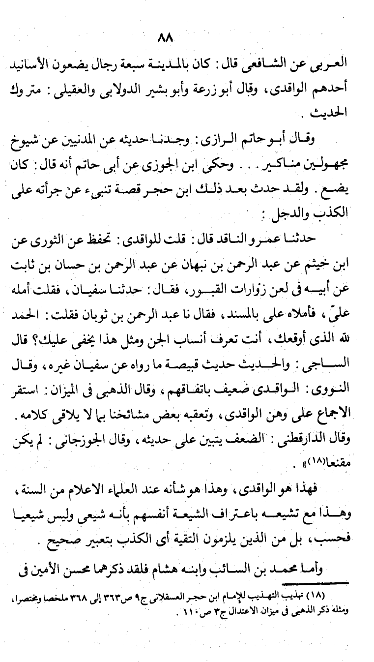 فهذا هو الواقدي، وهذا هو شأنه عند العلماء الأعلام من السنة، وهذا مع تشيعه باعتراف الشيعة أنفسهم بأنه شيعي وليس شيعياً فحسب، بل من الذين يلزمون التقية أي الكذب بتعبير صحيح.