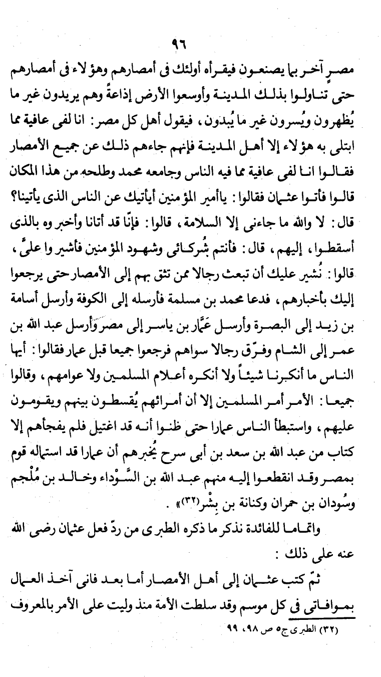 مصر آخر بما يصنعون فيقرأه أولئك في أمصارهم وهؤلاء في أمصارهم حتى تنالوا بذلك المدينة وأوسعوا الأرض إذاعة وهم يريدون غير ما يظهرون ويسرون غير ما يبدون، فيقول أهل كل مصر: إنا لفي عافية مما ابتلي به هؤلاء إلا أهل المدينة فإنهم جاءهم ذلك عن جميع الأمصار فقالوا إنا لفي عافية مما فيه الناس وجامعه محمد وطلحة من هذا المكان قالوا فأتوا عثمان فقالوا: يا أمير المؤمنين أيأتيك عن الناس الذي يأتينا؟ قال: لا والله ما جاءني إلا السلامة، قالوا: فإنا قد أتانا وأخبروه بالذي أسقطوا، إليهم: قال فأنتم شركائي وشهود المؤمنين فأشيروا علي، قالوا نشير عليك أن تبعث رجالاً ممن تثق بهم إلى الأمصار حتى يرجعوا إليك بأخبارهم، فدعا محمد بن مسلمة فأرسله إلى الكوفة وأرسل أسامة بن زيد إلى البصرة وأرسل عمار بن ياسر إلى مصر وأرسل عبد الله بن عمر إلى الشام وفرق رجالا سواهم فرجعوا جميعاً قبل عمار فقالوا: أيها الناس ما أنكرنا شيئاً ولا أنكره أعلام المسلمين ولا عوامهم، وقالوا جميعاً: الأمر أمر المسلمين إلا أن أمرائهم يقسطون بينهم ويقومون عليهم، واستبطأ الناس عمار حتى ظنوا أنه قد اغتيل فلم يفجأهم إلا كتاب من عبد الله بن سعد بن أبي سرح يخبرهم أن عماراً قد استماله قوم بمصر وقد انقطعوا إليه منهم عبد الله بن السوداء وخالد بن ملجم وسودان بن حمران وكنانة بن بشر (¬1) ".