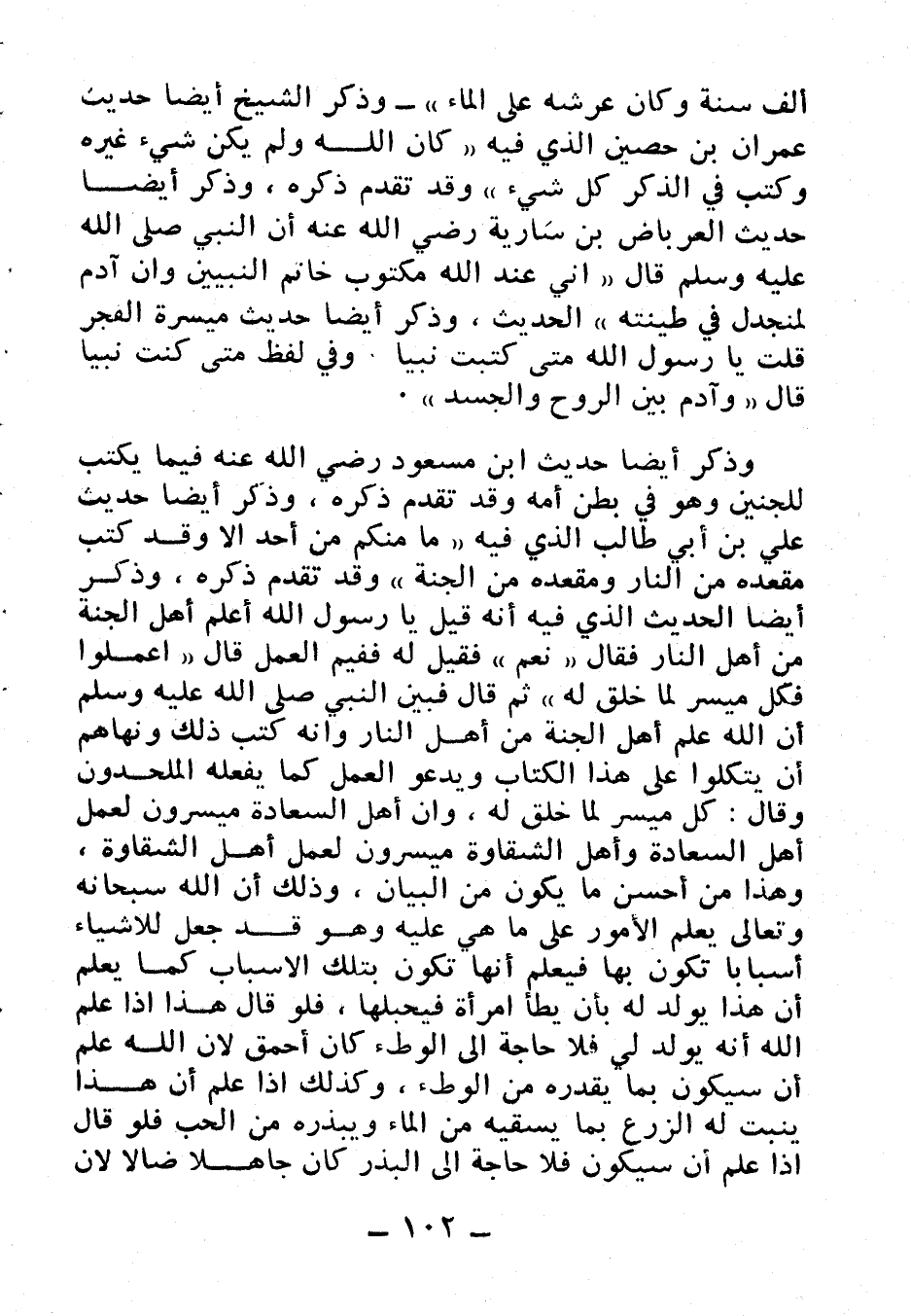 ألف سنة وكان عرشه على الماء» وذكر الشيخ أيضا حديث عمران بن حصين الذي فيه «كان الله ولم يكن شيء غيره وكتب في الذكر كل شيء» وقد تقدم ذكره، وذكر أيضا حديث العرباض بن سارية رضي الله عنه أن النبي صلى الله عليه وسلم قال: «إني عند الله مكتوب خاتم النبيين وإن آدم لمنجدل في طينته» الحديث، وذكر أيضا حديث ميسرة الفجر قلت: يا رسول الله متى كتبت نبيا؟. وفي لفظ متى كنت نبيا؟ قال: «وآدم بين الروح والجسد».