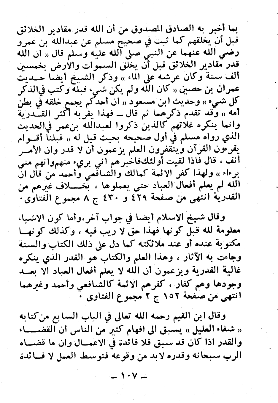 بما أخبر به الصادق المصدوق من أن الله قدر مقادير الخلائق قبل أن يخلقهم كما ثبت في صحيح مسلم عن عبد الله بن عمرو رضي الله عنهما عن النبي صلى الله عليه وسلم قال: «إن الله قدر مقادير الخلائق قبل أن يخلق السموات والأرض بخمسين ألف سنة وكان عرشه على الماء» وذكر الشيخ أيضا حديث عمران بن حصين «كان الله ولم يكن شيء قبله وكتب في الذكر كل شيء» وحديث ابن مسعود «إن أحدكم يجمع خلقه في بطن أمه» وقد تقدم ذكرهما ثم قال: فهذا يقرُّ به أكثر القدرية وإنما ينكره غلاتهم كالذين ذكروا لعبد الله بن عمر في الحديث الذي رواه مسلم في أول صحيحه بحيث قيل له «قبلنا أقوام يقرءون القرآن ويتقفرون العلم يزعمون أن لا قدر وأن الأمر أنف، قال: فإذا لقيت أولئك فأخبرهم أني بريء منهم وأنهم مني برءاء» ولهذا كَفَّرَ الأئمة كمالك والشافعي وأحمد من قال: إن الله لم يعلم أفعال العباد حتى يعملوها، بخلاف غيرهم من القدرية انتهى من صفحة 429 و 430 ج8 مجموع الفتاوى.