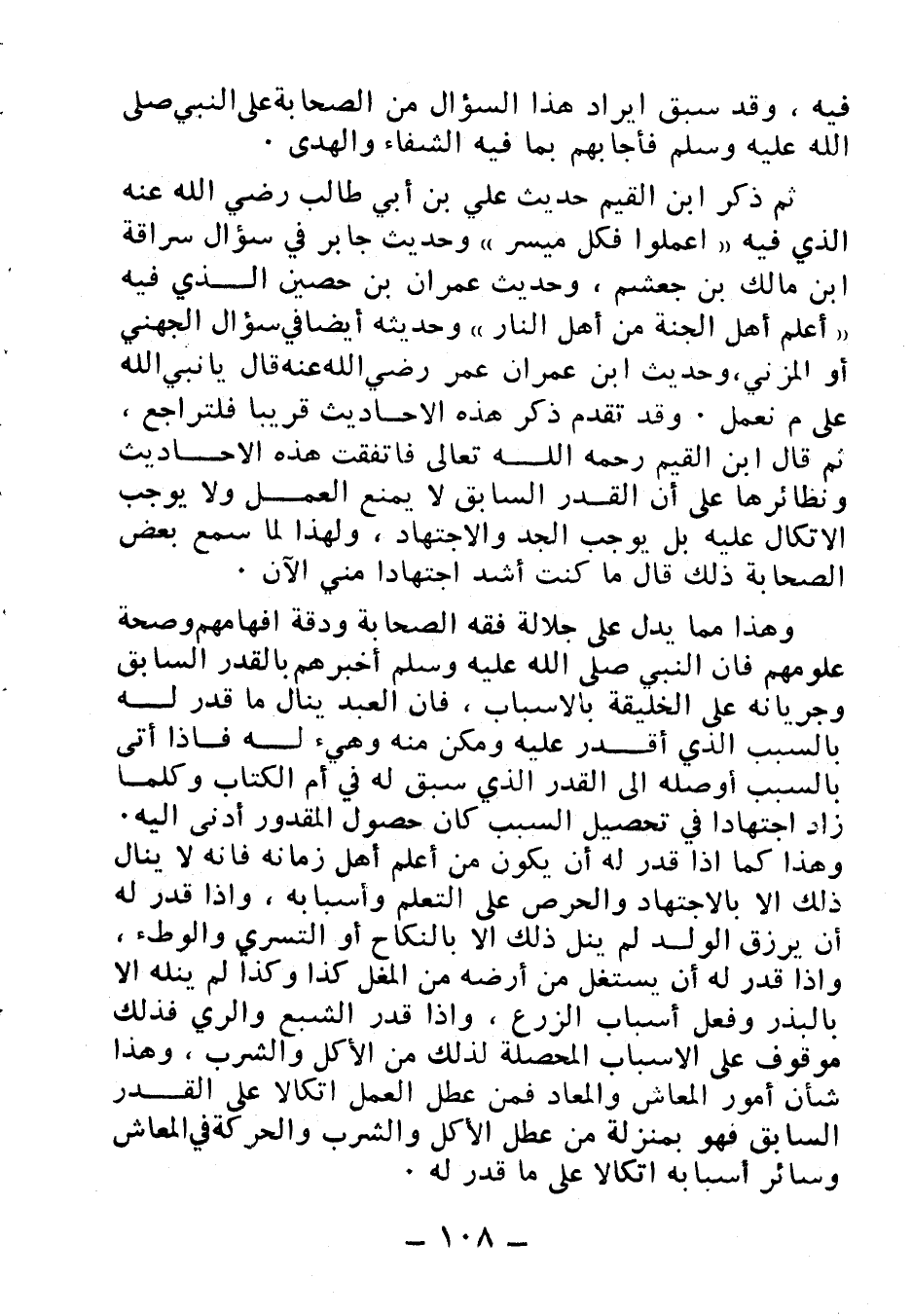 ثم ذكر ابن القيم حديث علي بن أبي طالب رضي الله عنه الذي فيه «اعملوا فكل ميسر» وحديث جابر في سؤال سراقة بن مالك بن جعشم، وحديث عمران بن حصين الذي فيه «أعلم أهل الجنة من أهل النار» وحديثه أيضا في سؤال الجهني أو المزني، وحديث ابن عمران عمر رضي الله عنه قال: يا نبي الله فعلى ما نعمل. وقد تقدم ذكر هذه الأحاديث قريبا فلتراجع، ثم قال ابن القيم رحمه الله تعالى: فاتفقت هذه الأحاديث ونظائرها على أن القدر السابق لا يمنع العمل ولا يوجب الاتكال عليه بل يوجب الجد والاجتهاد، ولهذا لما سمع بعض الصحابة ذلك قال ما كنت أشد اجتهادا مني الآن.