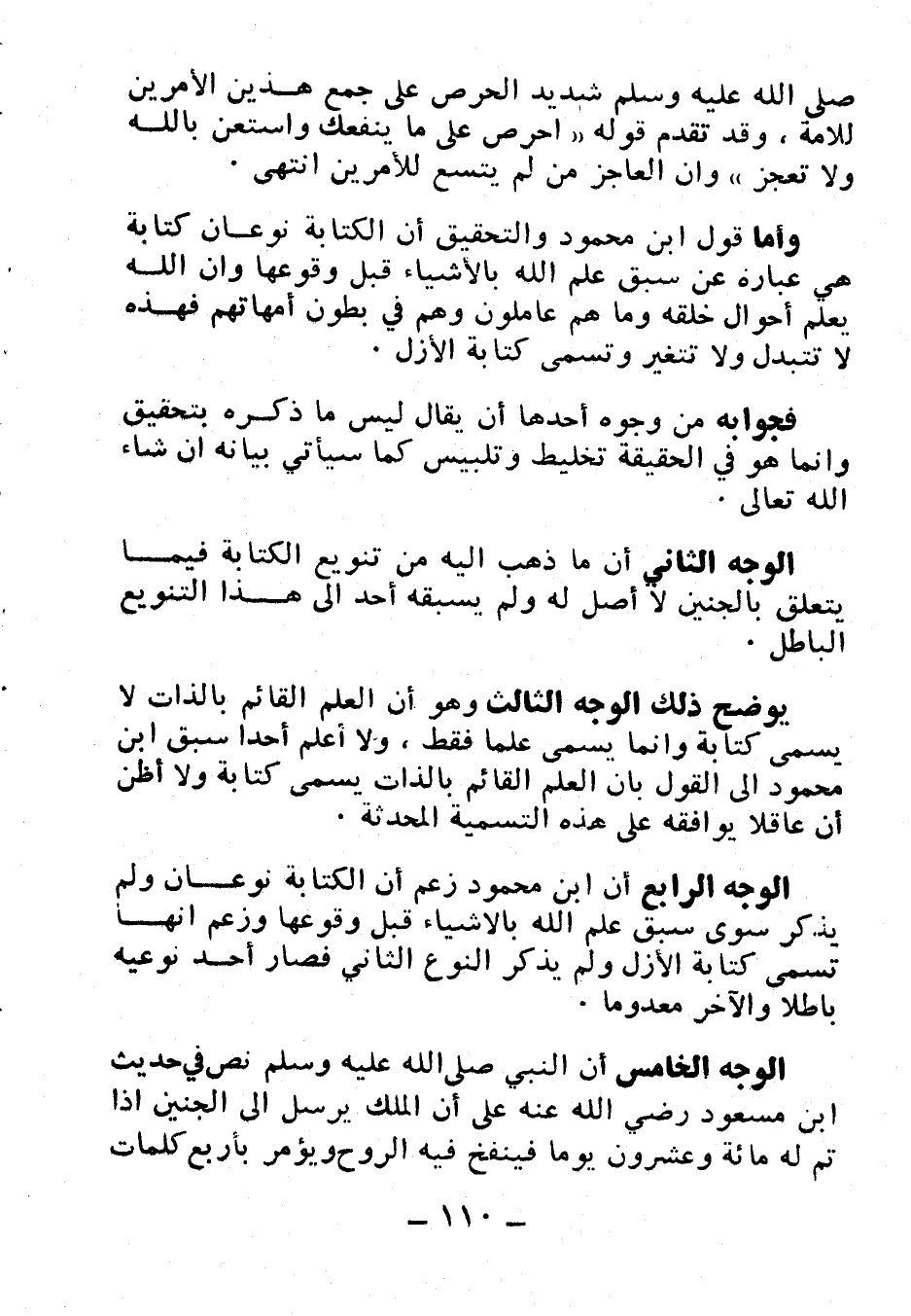 الوجه الرابع أن ابن محمود زعم أن الكتابة نوعان ولم يذكر سوى سبق علم الله بالأشياء قبل وقوعها وزعم أنها تسمى كتابة الأزل ولم يذكر النوع الثاني فصار أحد نوعيه باطلا والآخر معدوما.