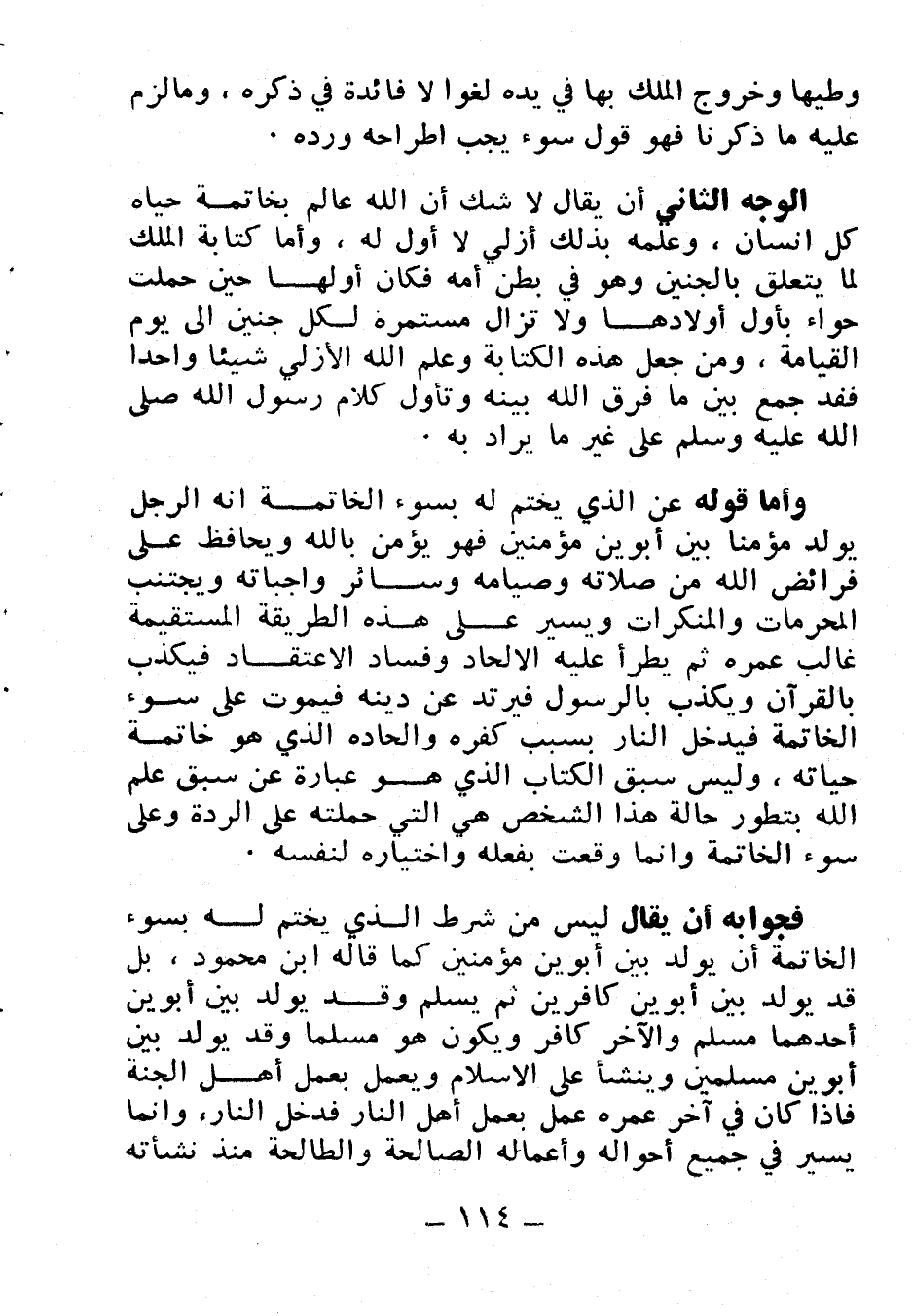 وأما قوله عن الذي يختم له بسوء الخاتمة أنه الرجل يولد مؤمنا بين أبوين مؤمنين فهو يؤمن بالله ويحافظ على فرائض الله من صلاته وصيامه وسائر واجباته ويجتنب المحرمات والمنكرات ويسير على هذه الطريقة المستقيمة غالب عمره ثم يطرأ عليه الإلحاد وفساد الاعتقاد فيكذب بالقرآن ويكذب بالرسول فيرتد عن دينه فيموت على سوء الخاتمة فيدخل النار بسبب كفره وإلحاده الذي هو خاتمة حياته، وليس سبق الكتاب الذي هو عبارة عن سبق علم الله بتطور حالة هذا الشخص هي التي حملته على الردة وعلى سوء الخاتمة وإنما وقعت بفعله واختياره لنفسه.