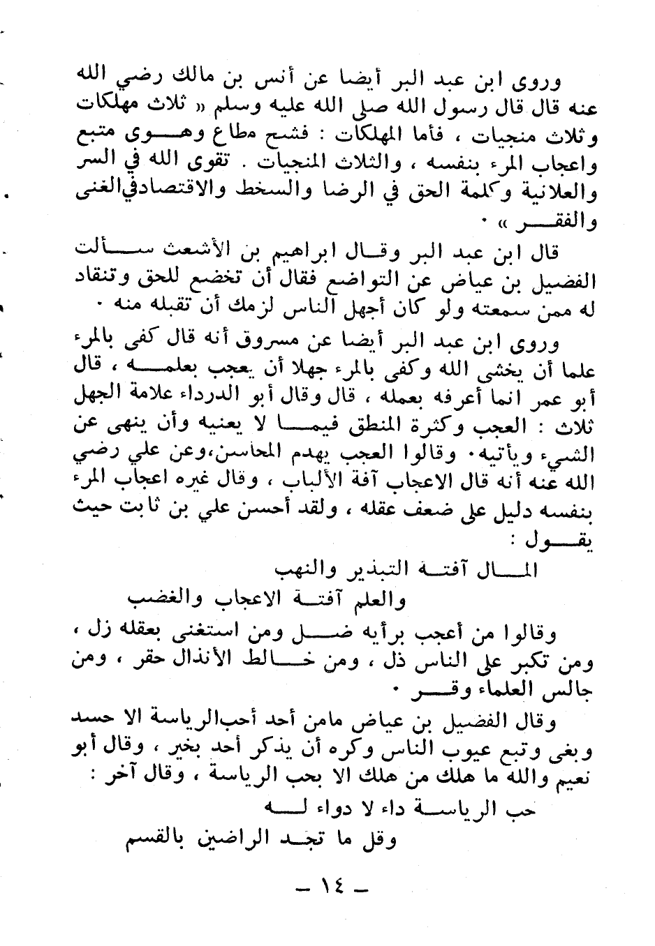 وروى ابن عبد البر أيضا عن أنس بن مالك رضي الله عنه قال: قال رسول الله صلى الله عليه وسلم: «ثلاث مهلكات وثلاث منجيات، فأما المهلكات: فشح مطاع, وهوى متبع, وإعجاب المرء بنفسه، والثلاث المنجيات: تقوى الله في السر والعلانية ,وكلمة الحق في الرضا والسخط, والاقتصاد في الغنى والفقر».
